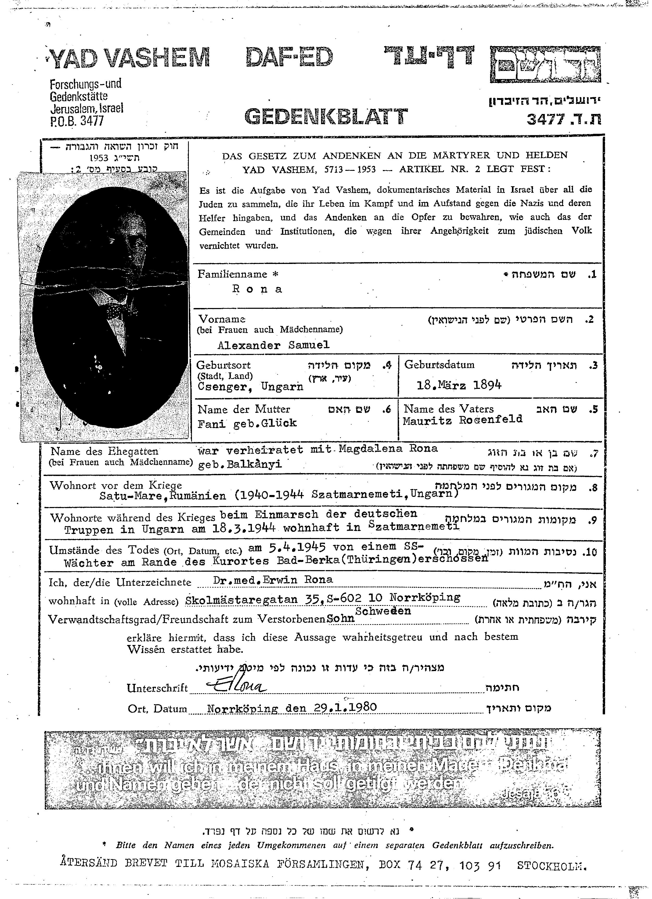 Rona | Alexander Samuel | 1894 | Satu Mare, Roumanie | Feuille de témoignage |