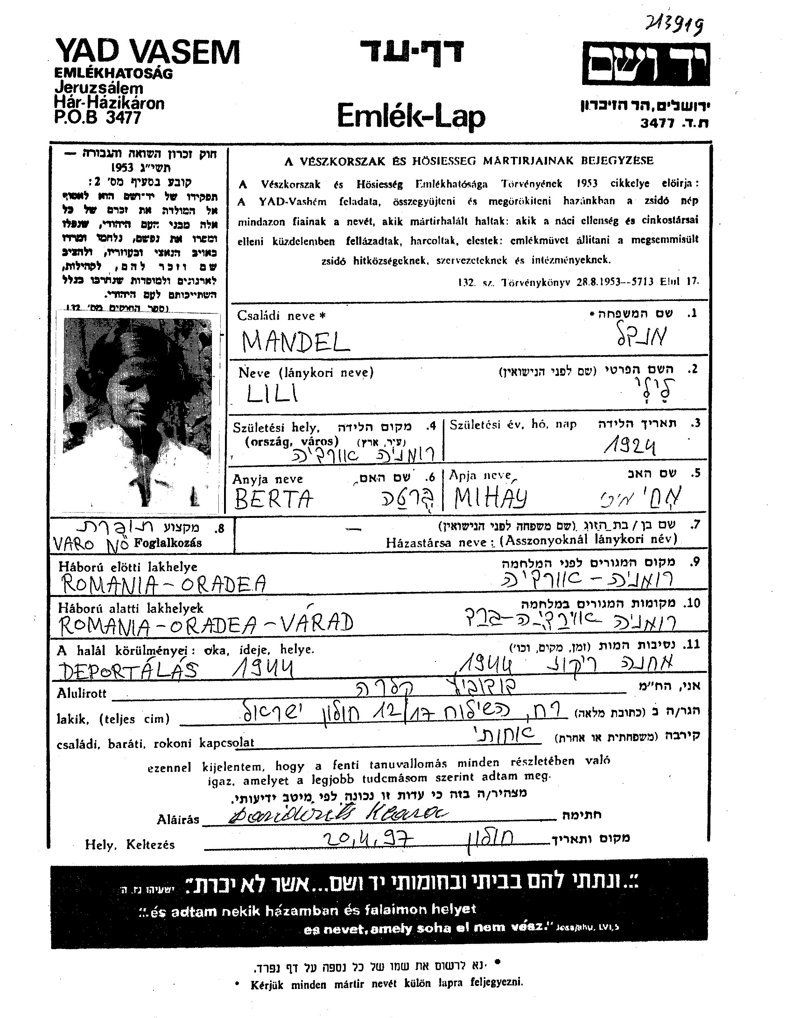 Lili Mandel est née à Oradea, Roumanie en 1924. Elle était Couturière. Avant la seconde guerre mondiale elle vivait à Oradea, Roumanie.