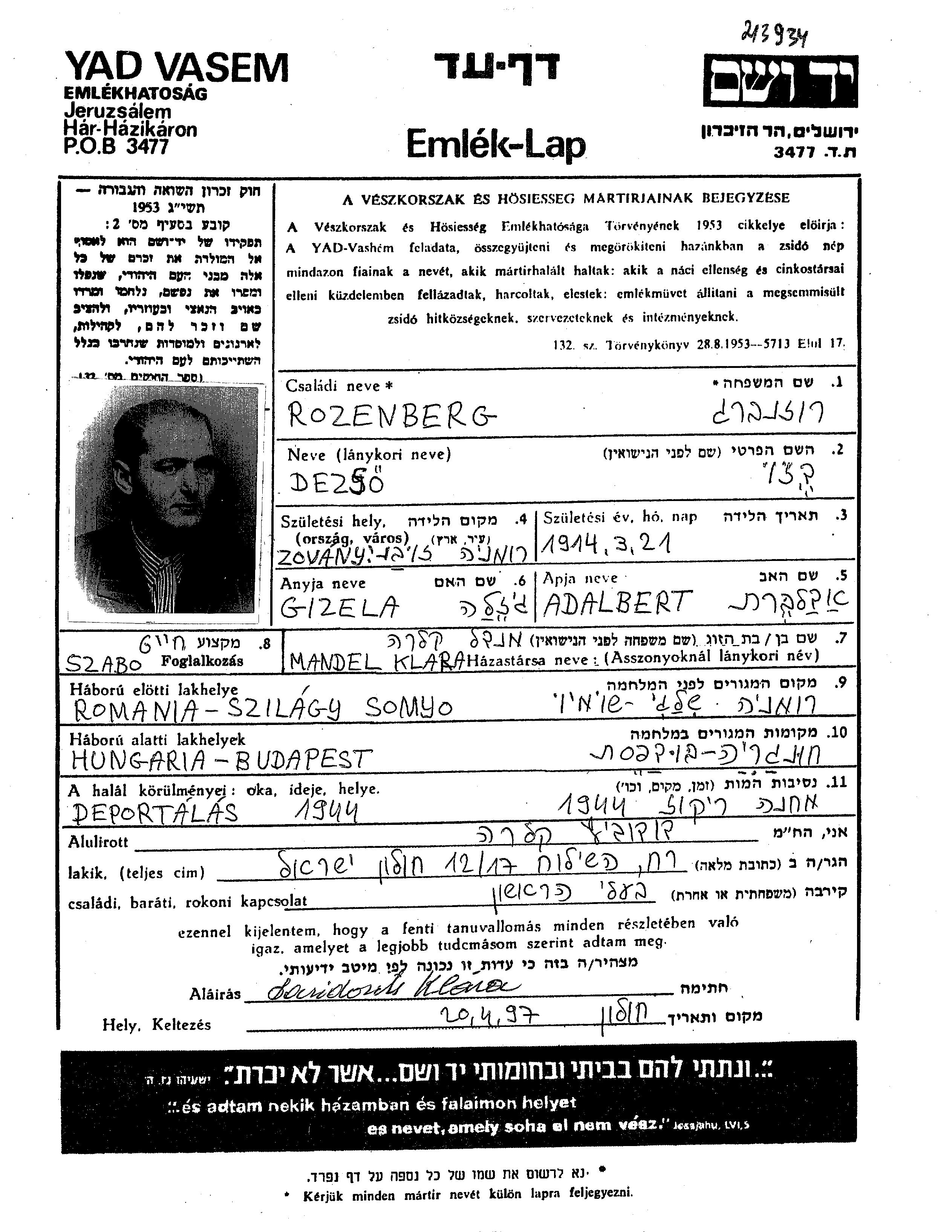 Rozenberg Deszo 1921 Szilagysomlyo, Roumanie Feuille de témoignage