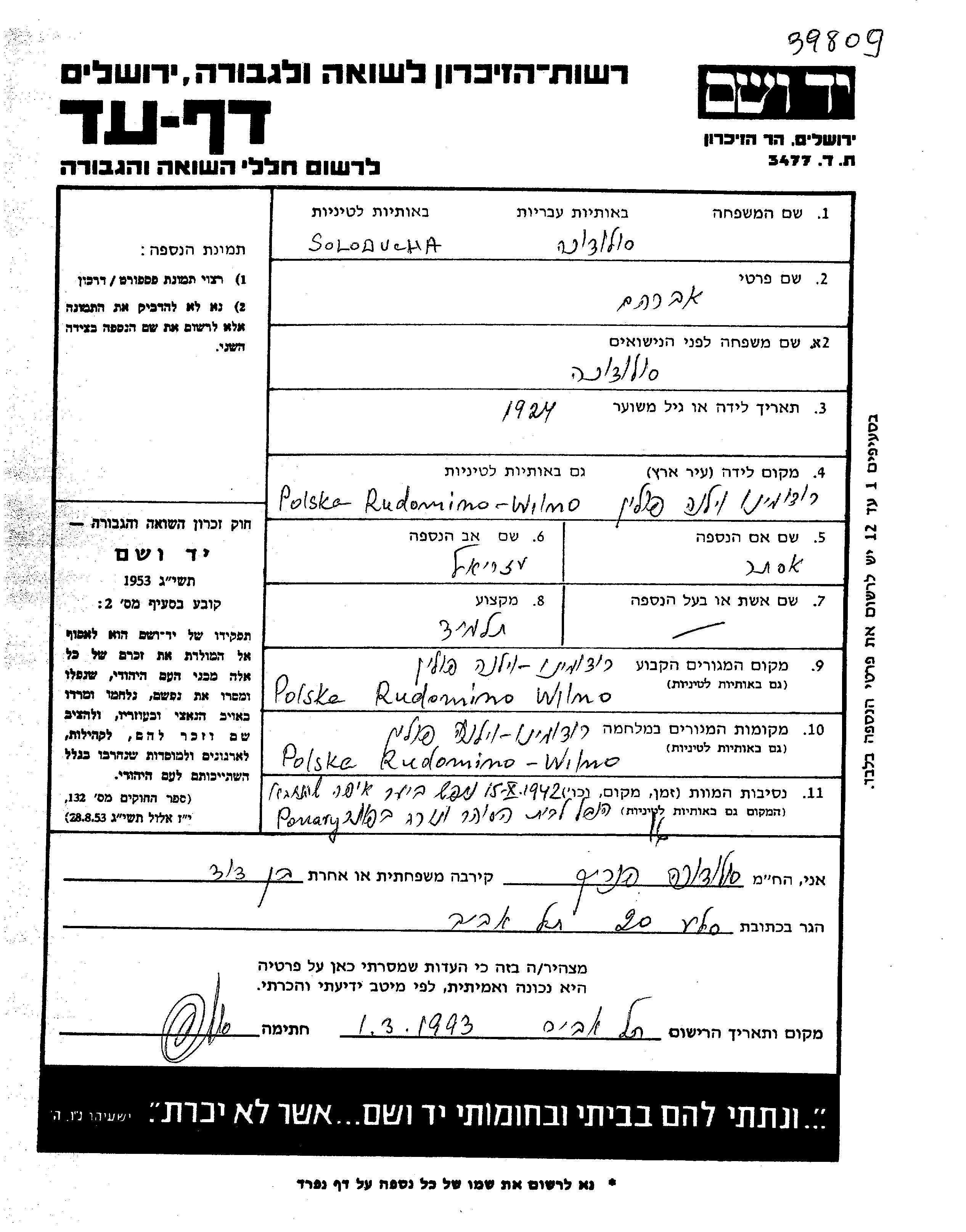 Soloducha Avraham 1924 Vilnius, Pologne Feuille de témoignage