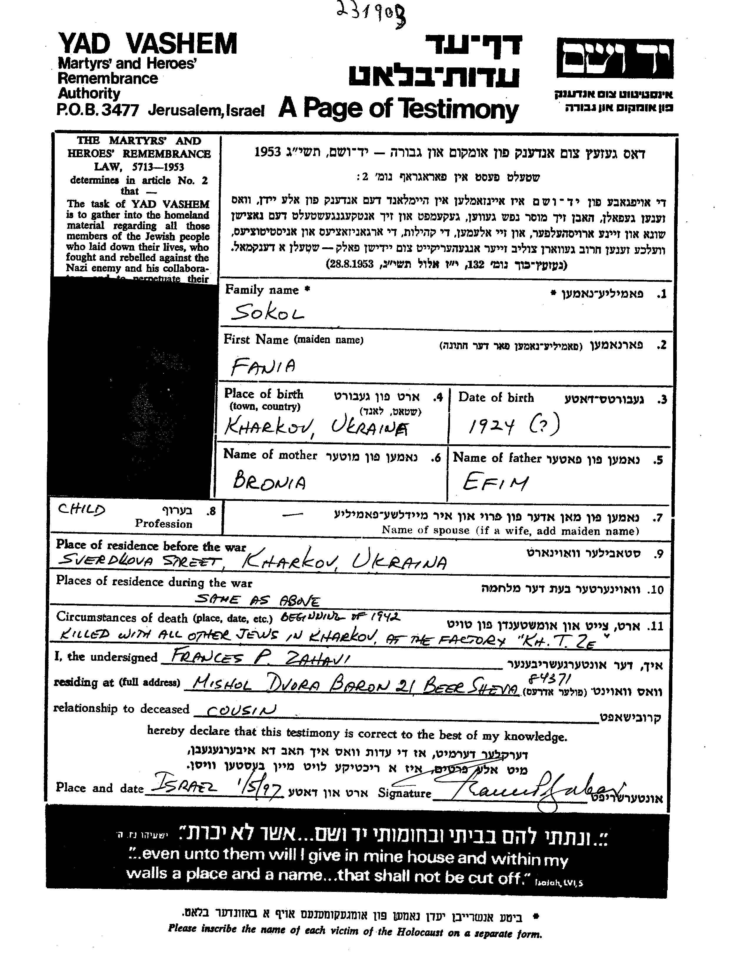 Yad Vashem - Pages of Testimony Names Memorial Collection