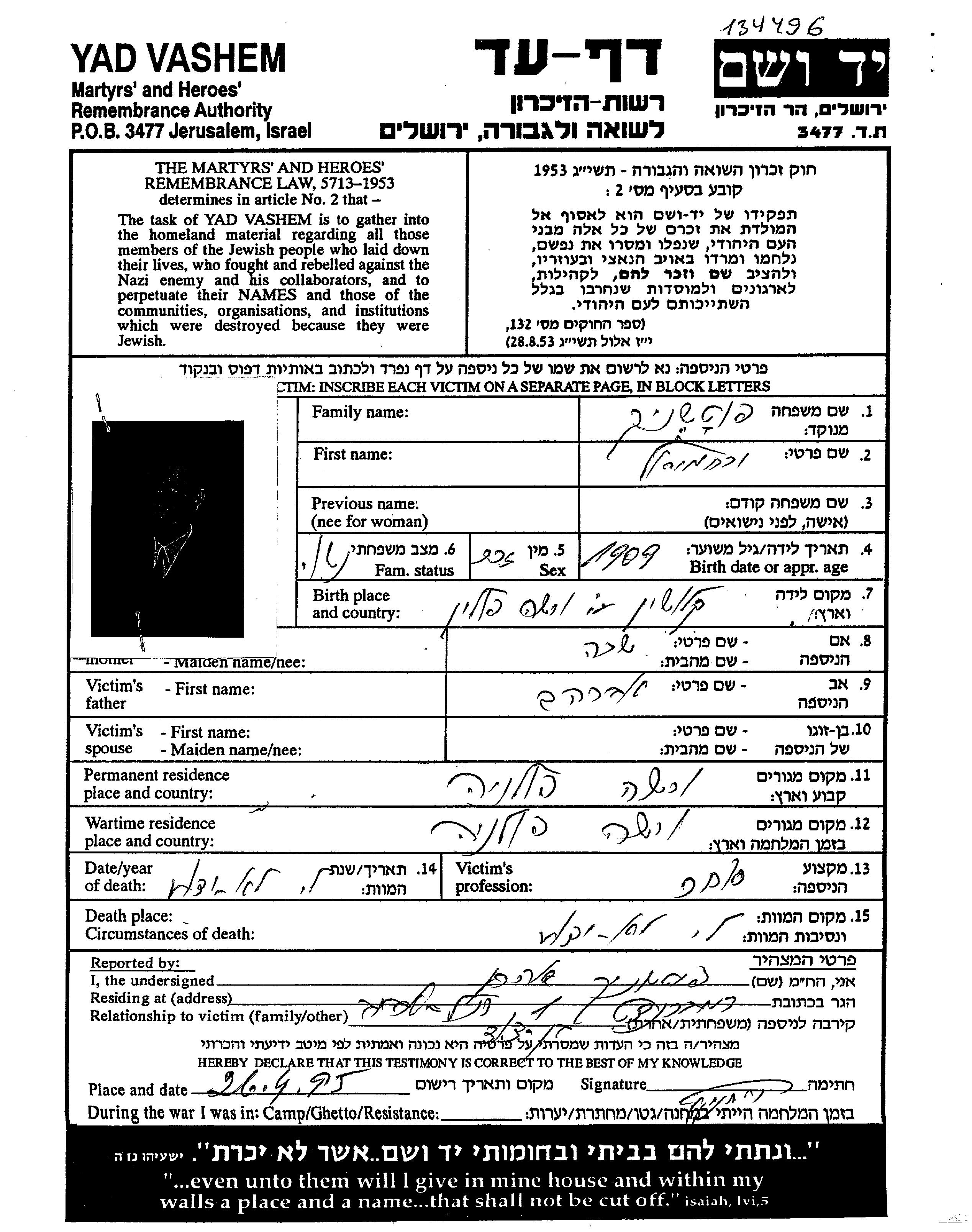 Yad Vashem - Pages of Testimony Names Memorial Collection
