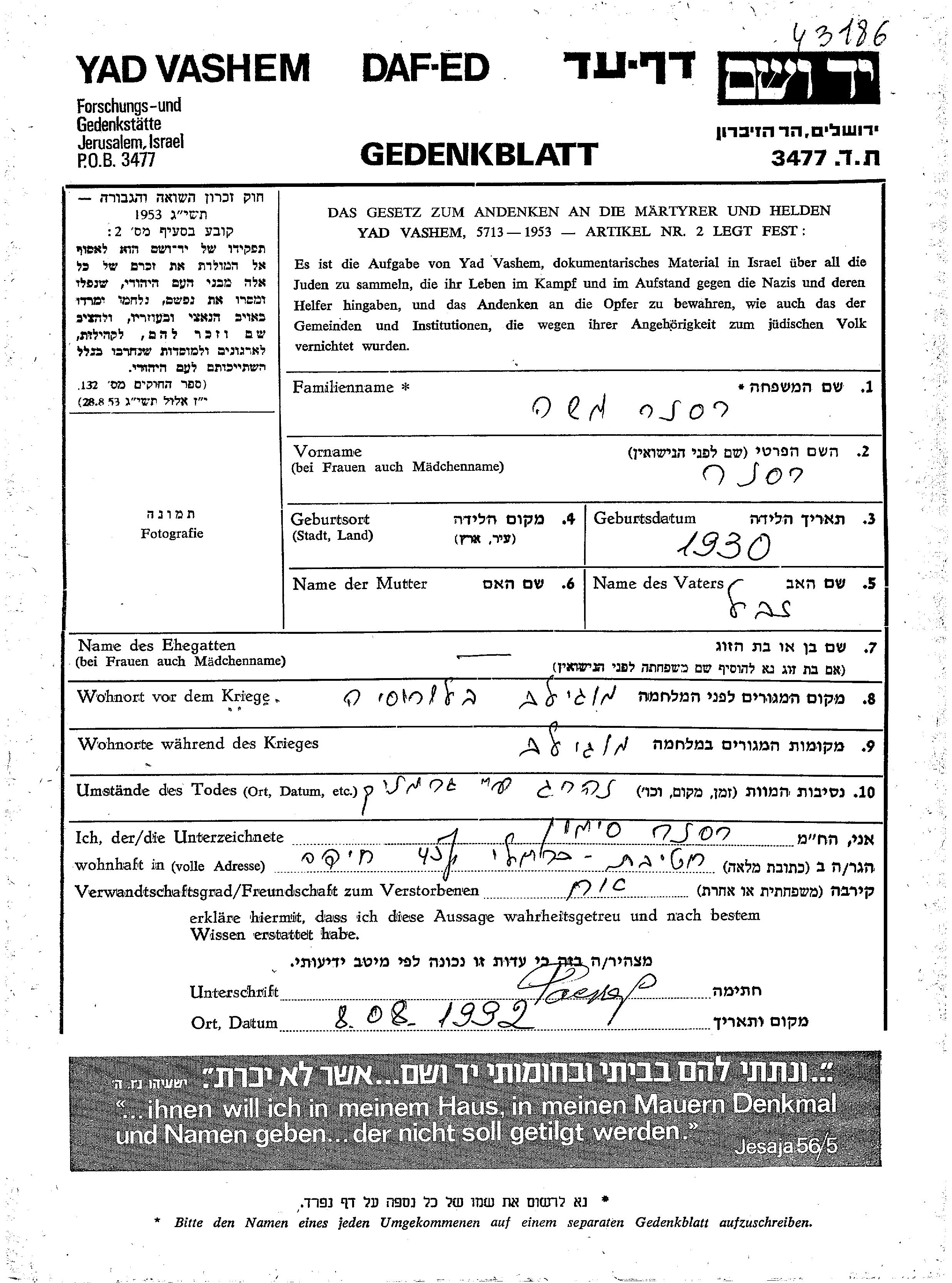 Yad Vashem - Pages of Testimony Names Memorial Collection