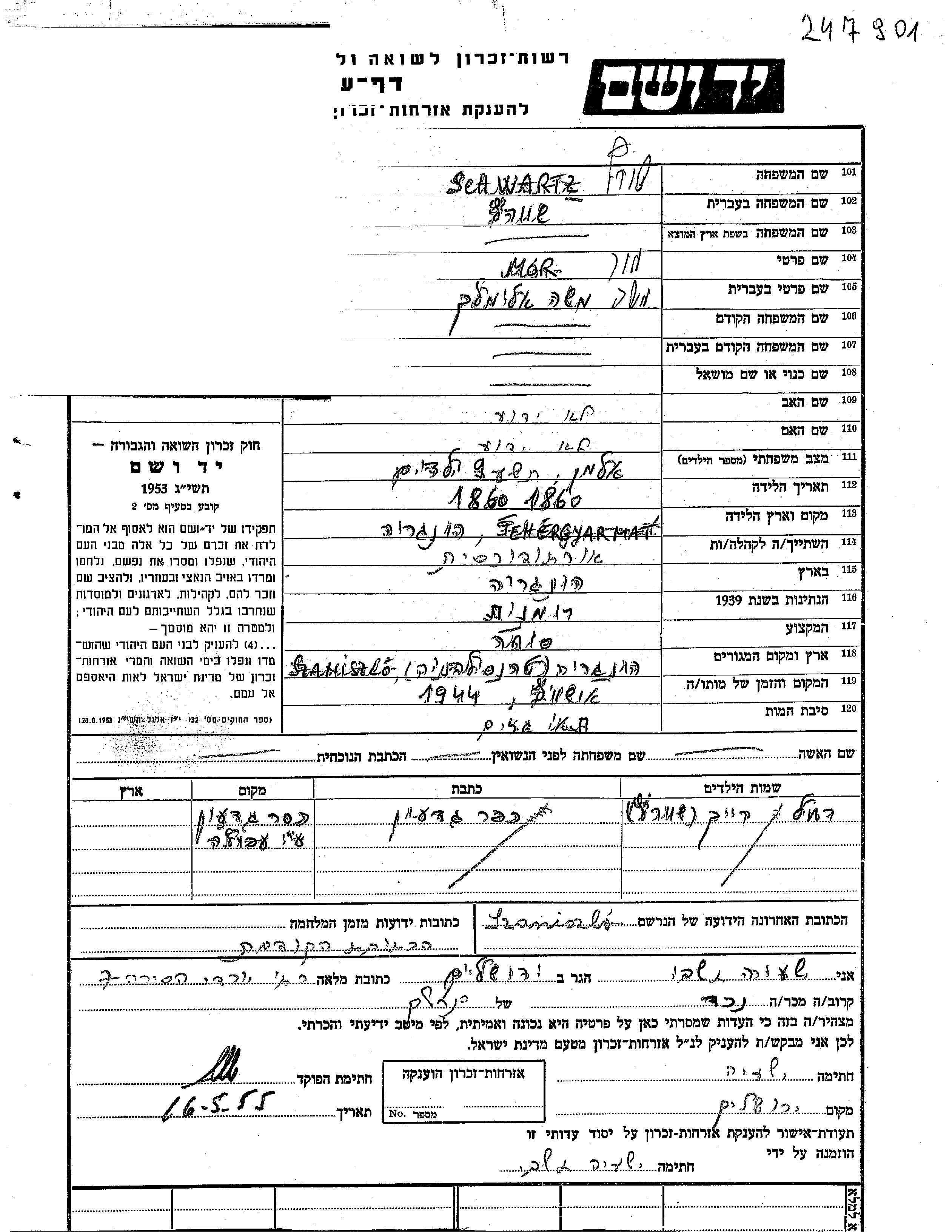 Schwartz Elimelech Moshe Sanislau, Roumanie Feuille de témoignage