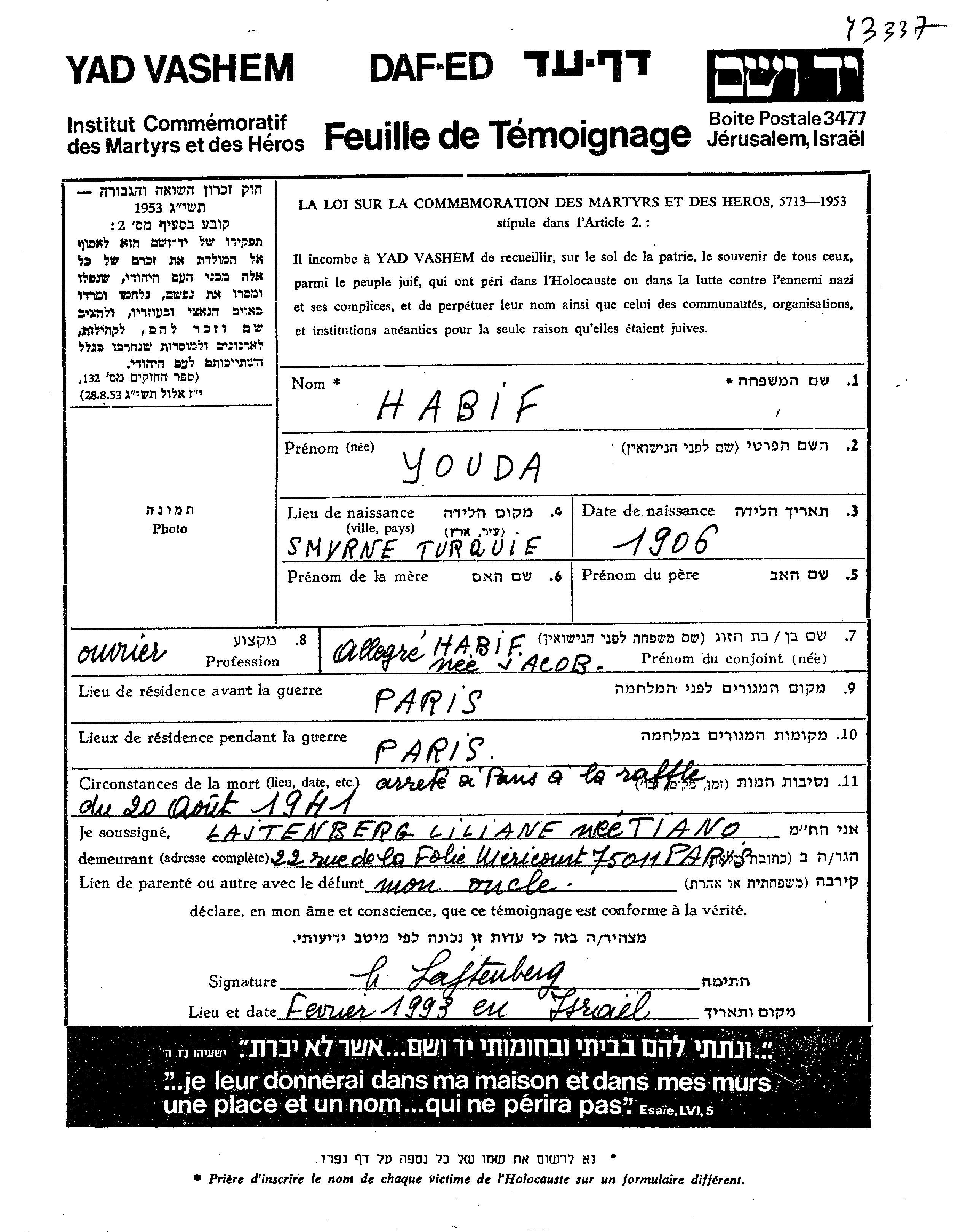 Habif Youda 1906 Paris, France Feuille de témoignage