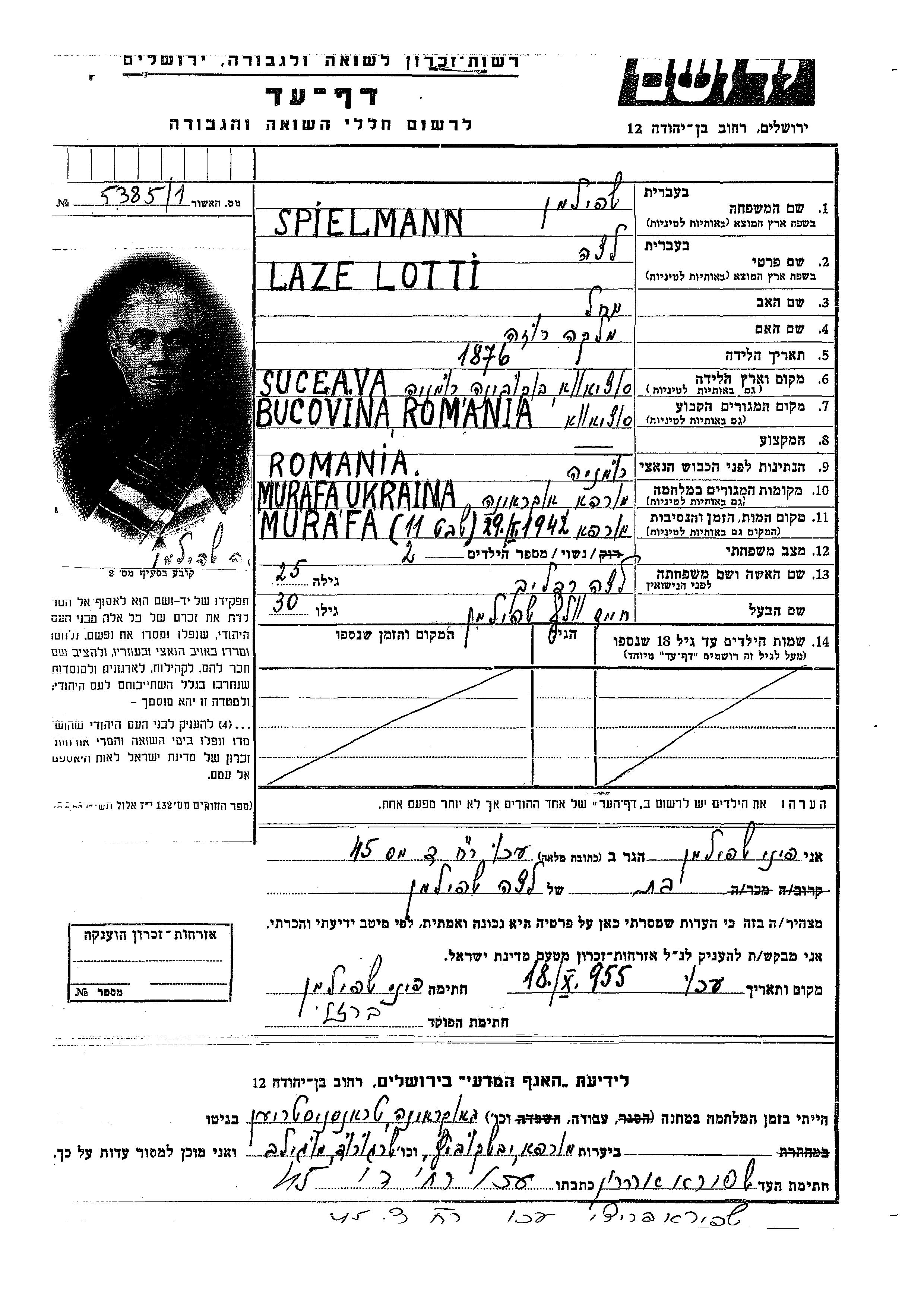 Laze Lotti Lea Spielmann née Redlikh est née à Suceava, Roumanie en 1876. Avant la seconde guerre mondiale elle vivait à Bukovina, Roumanie.