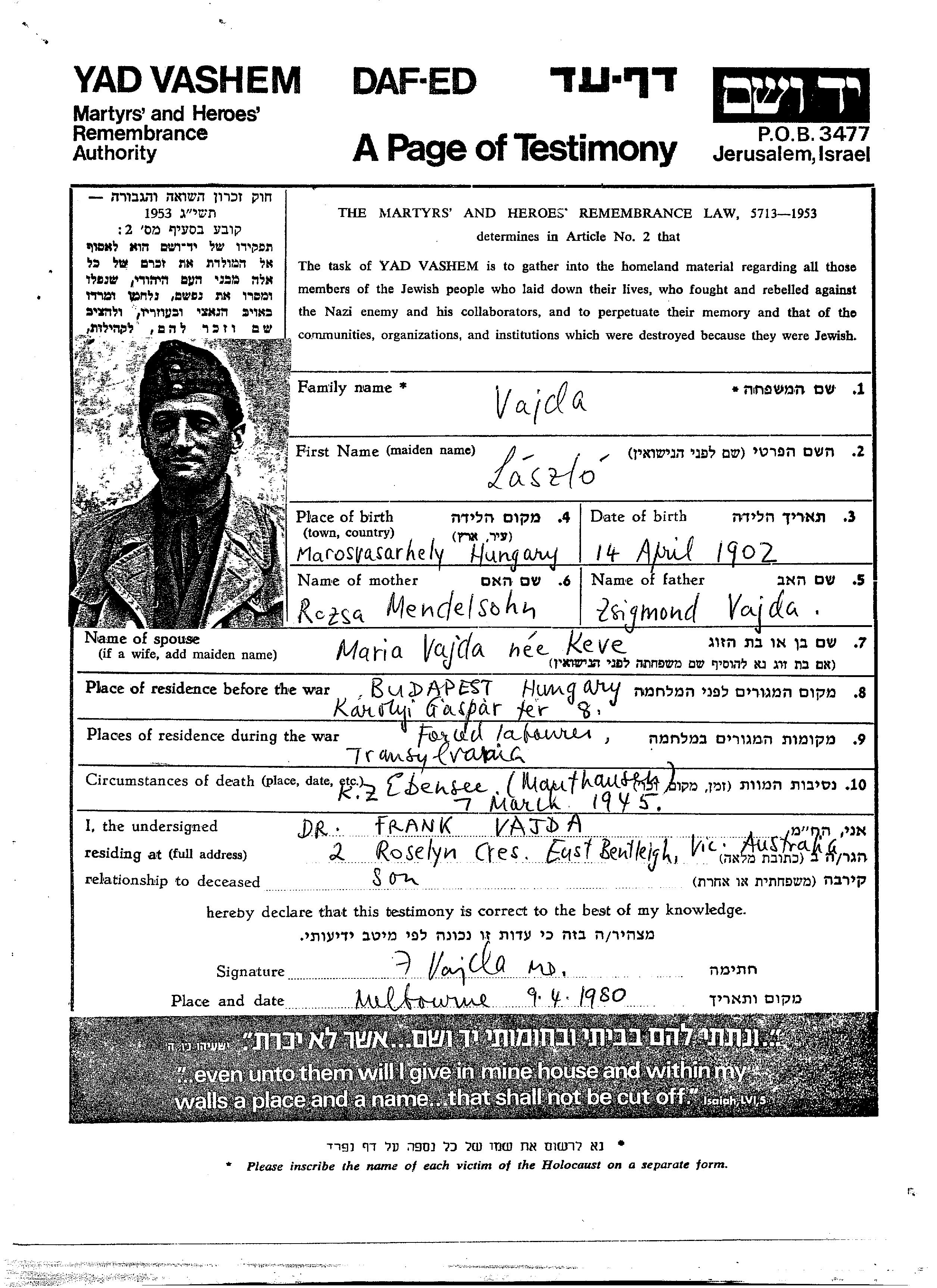 Vajda Laszlo 1902 Budapest, Hongrie Feuille de témoignage