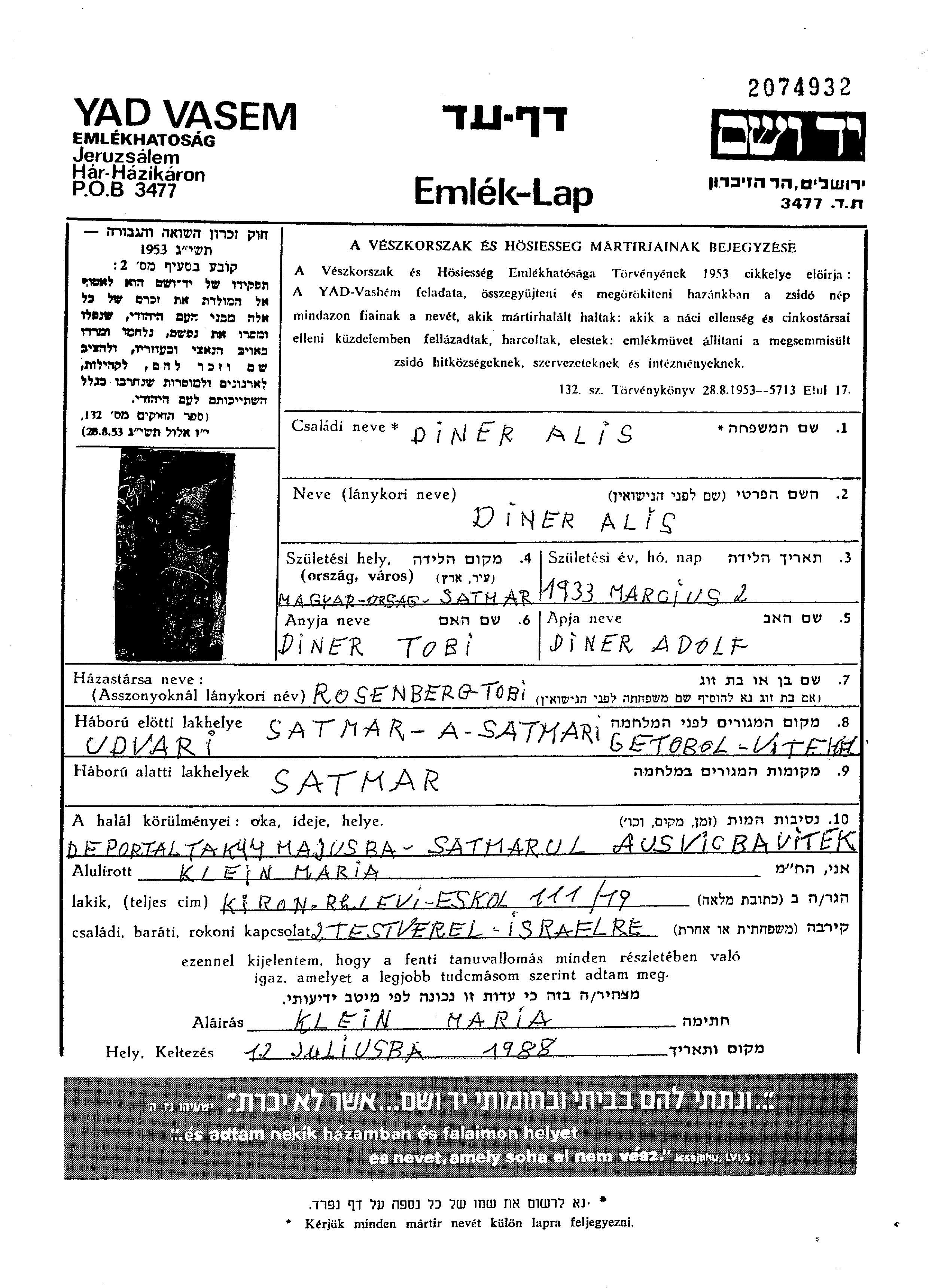 Diner | Alis Ellis | 1933 | Satmar, Roumanie | Feuille de témoignage |
