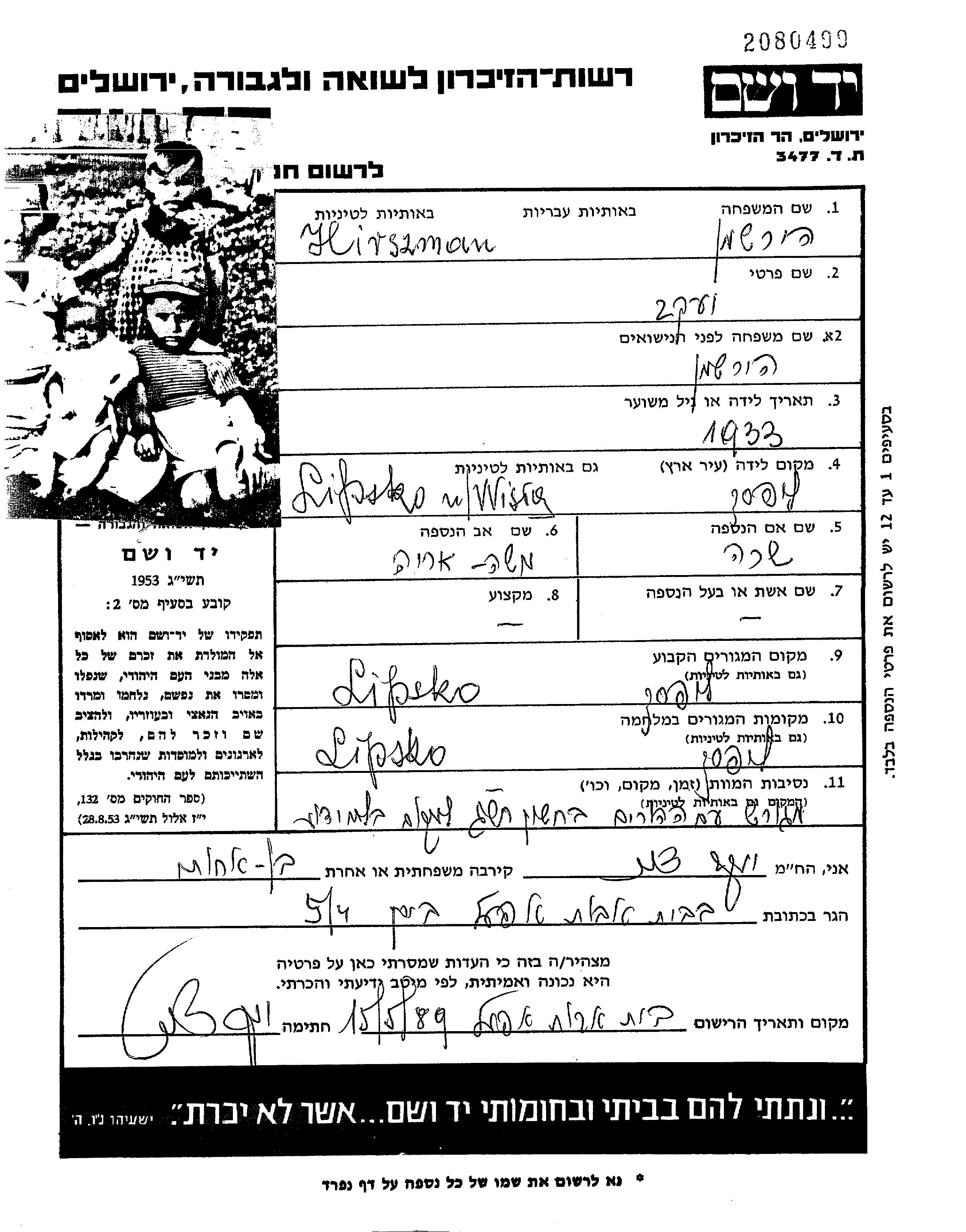 Hirszman | Yaakov | 1933 | Lipsko, Pologne | Feuille de témoignage |
