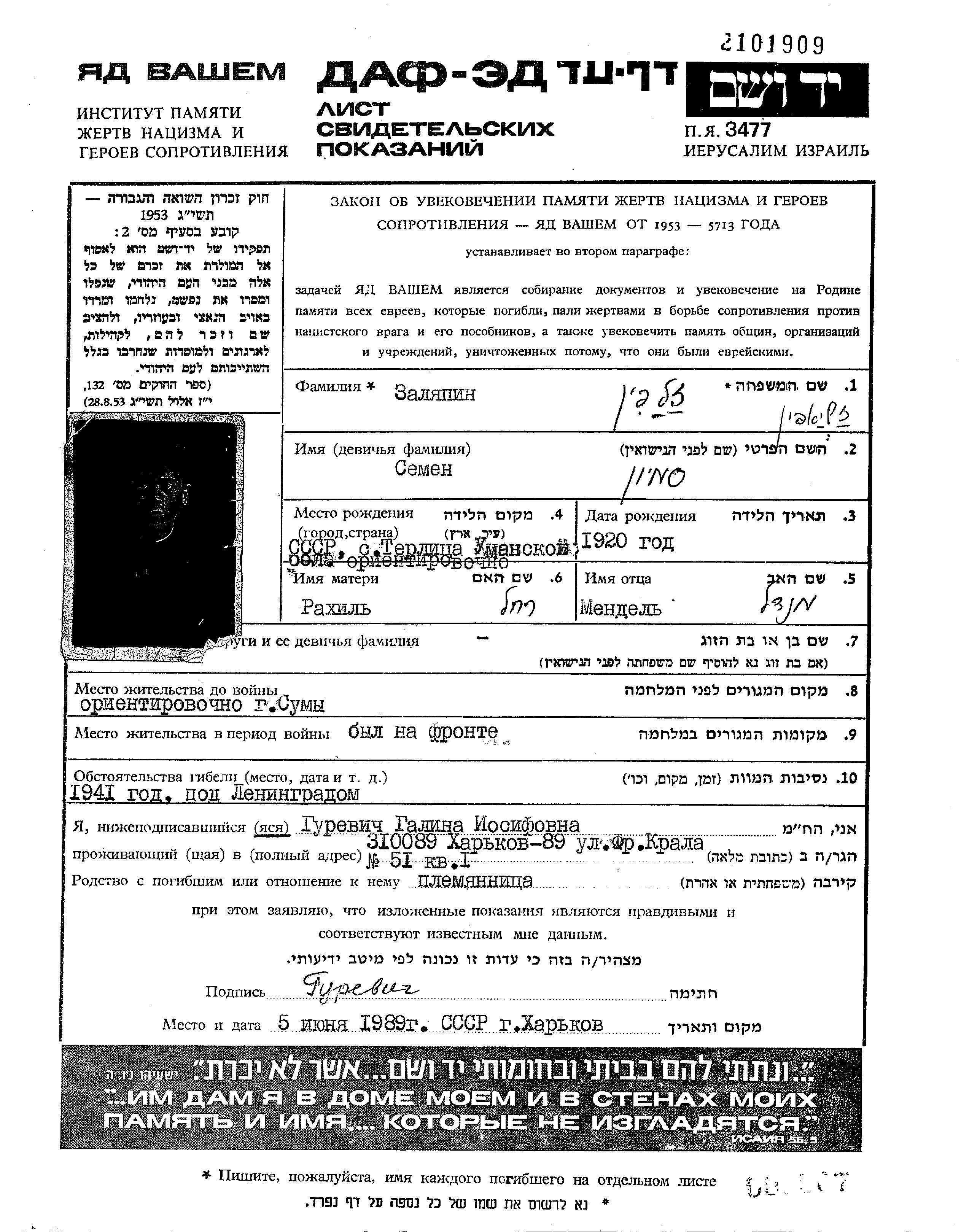 Zalyapin | Semyon | Sumy, Ukraine (URSS) | Feuille de témoignage | |