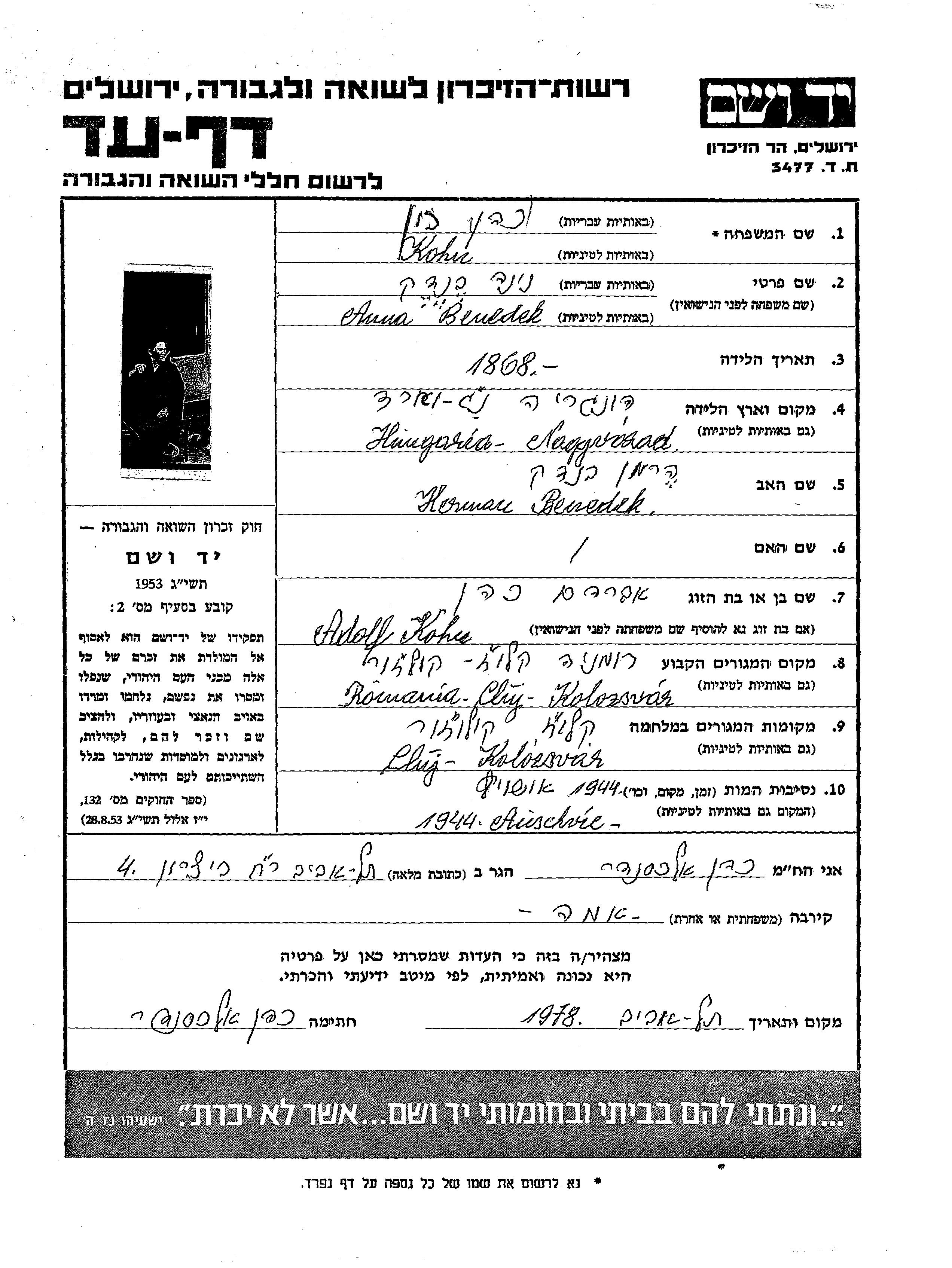 Kohn Kun | Anna Nina | 1868 | Kolozhvar, Roumanie | Feuille de témoignage |