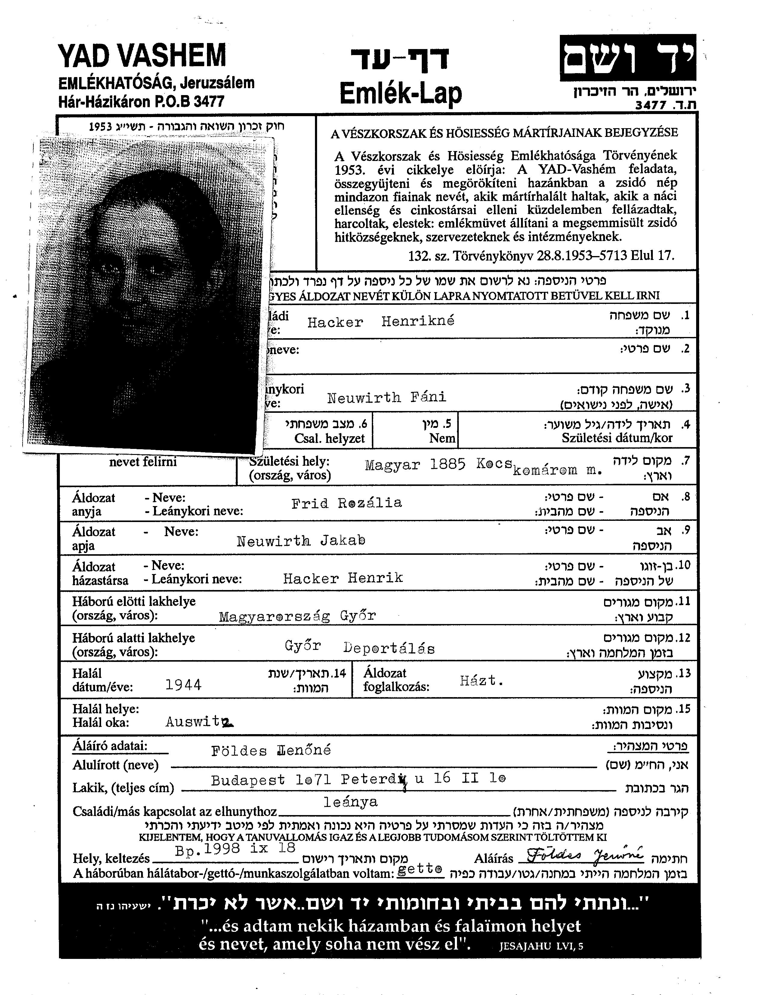 Hecker Fani Henrikne 1885 Gyor, Hongrie Feuille de témoignage