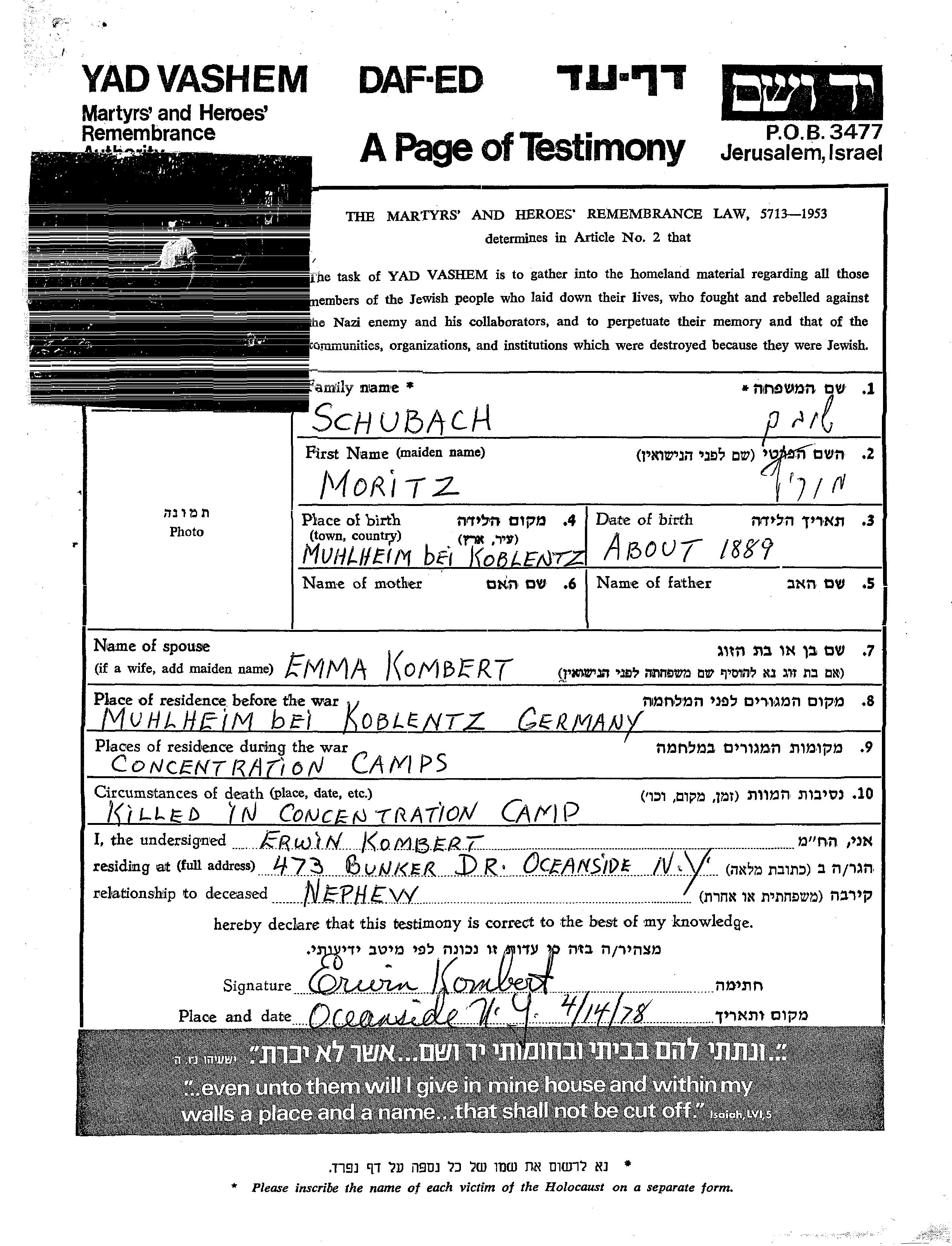 Schubach | Moritz | 1889 | Muehlheim, Allemagne | Feuille de témoignage |