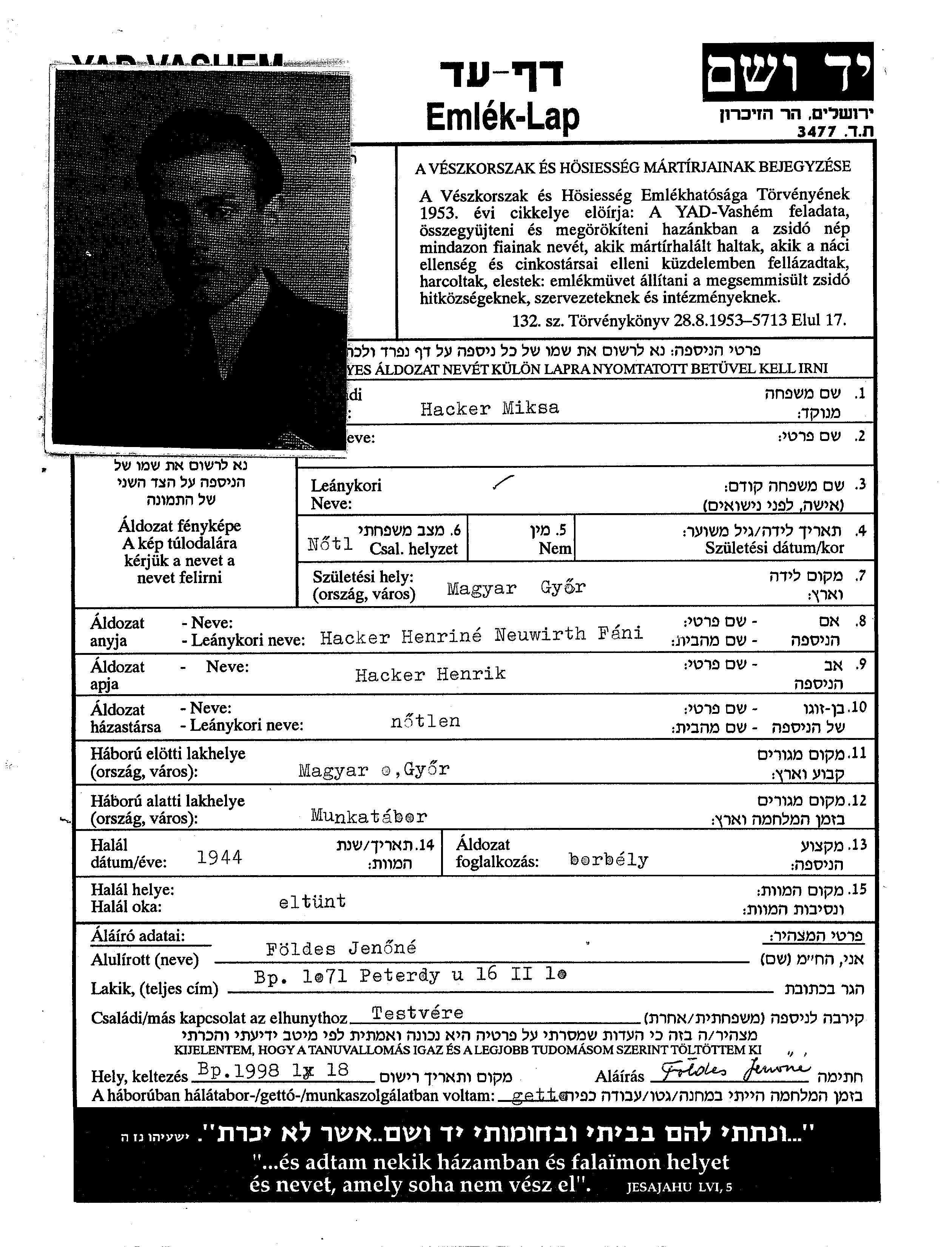 Miksa Hacker est né à Gyor, Hongrie. Il était Barbier. Avant la seconde guerre mondiale il vivait à Gyor, Hongrie.