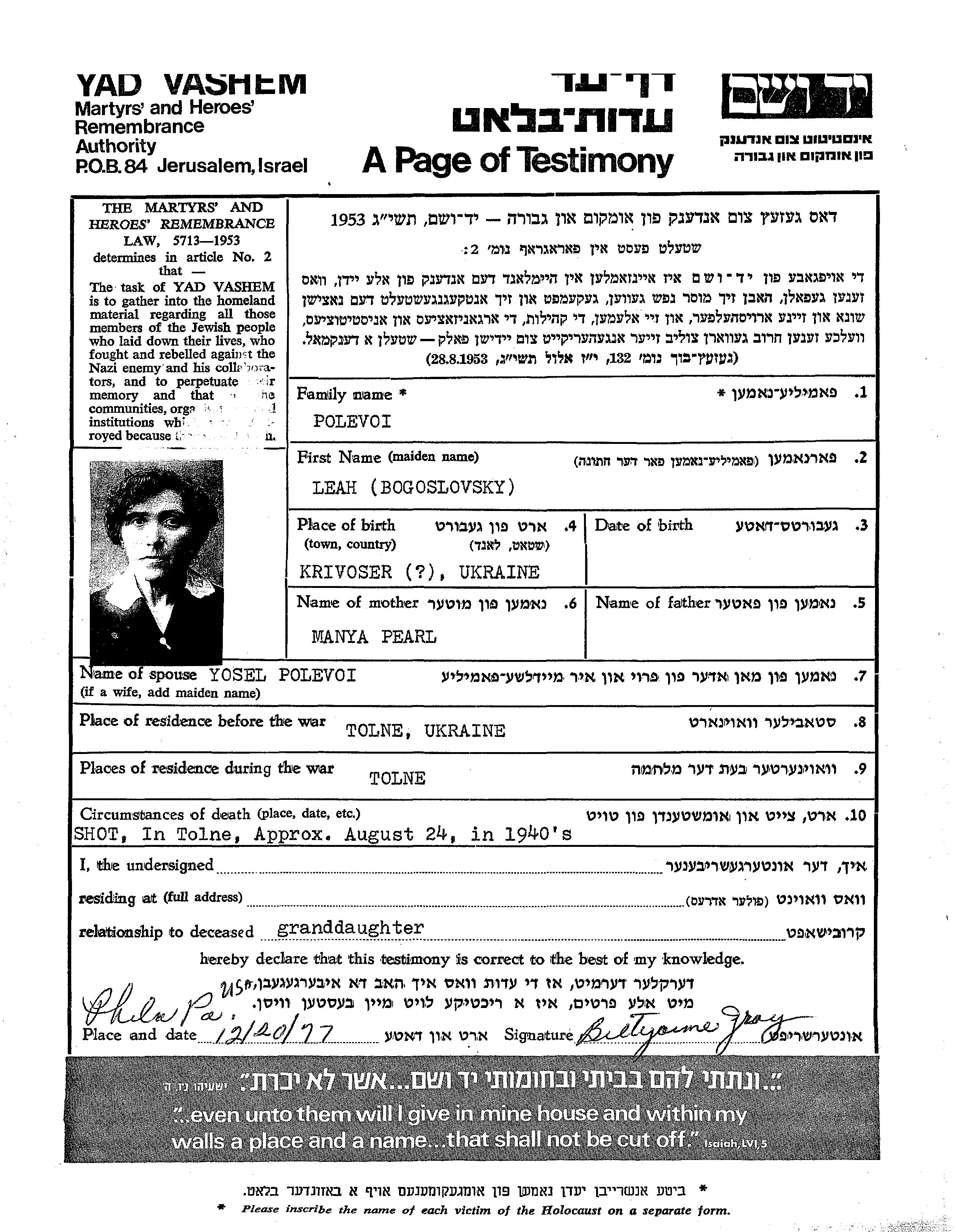 Leah Polevoi née Bogoslovsky est née à Krivoye Ozero, Ukraine (URSS). Avant la seconde guerre mondiale elle vivait à Tolne.