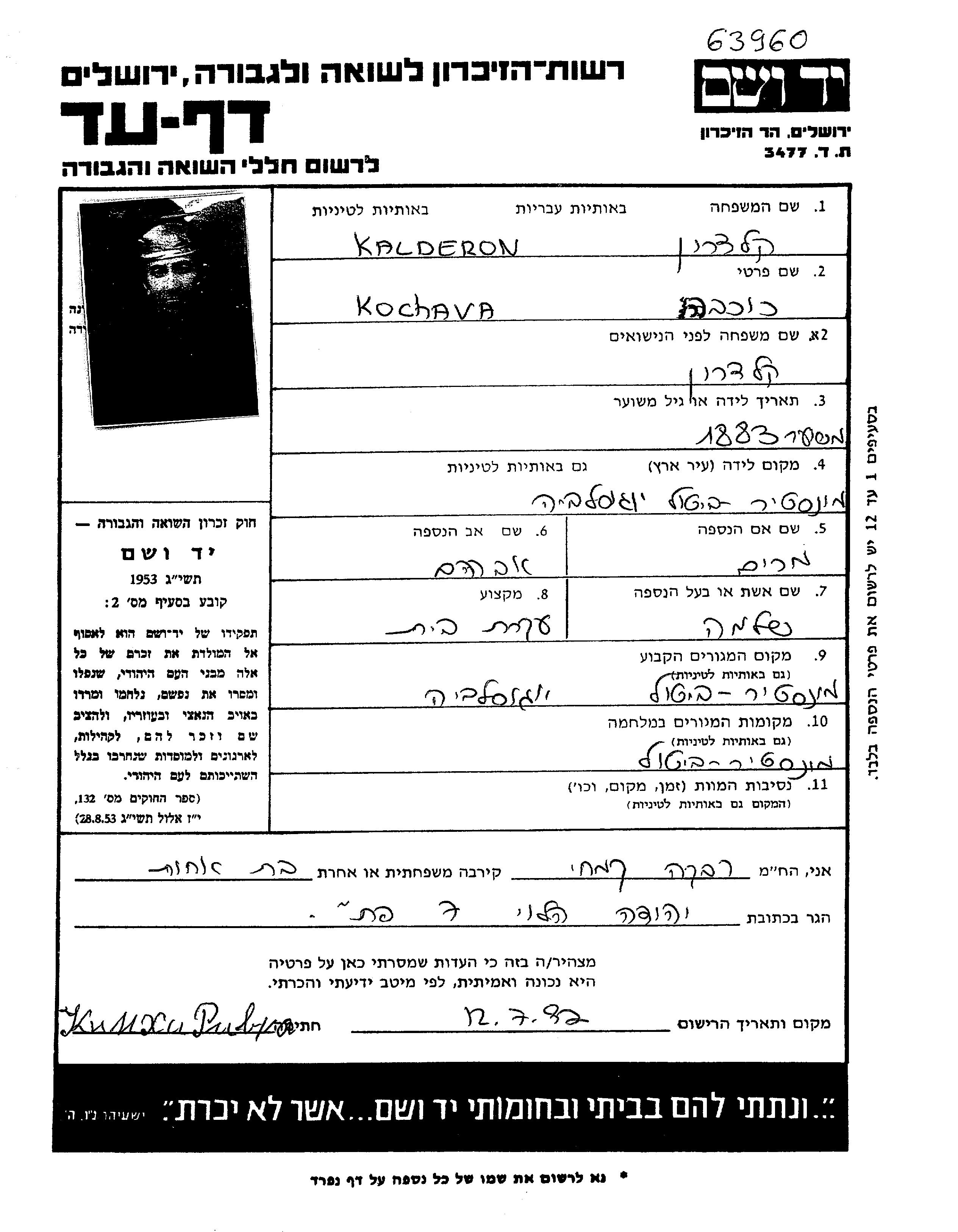Kochava Kalderon est née à Bitolj, Yugoslavie en 1883. Elle était Femme au foyer. Avant la seconde guerre mondiale elle vivait à Bitolj, Yugoslavie.