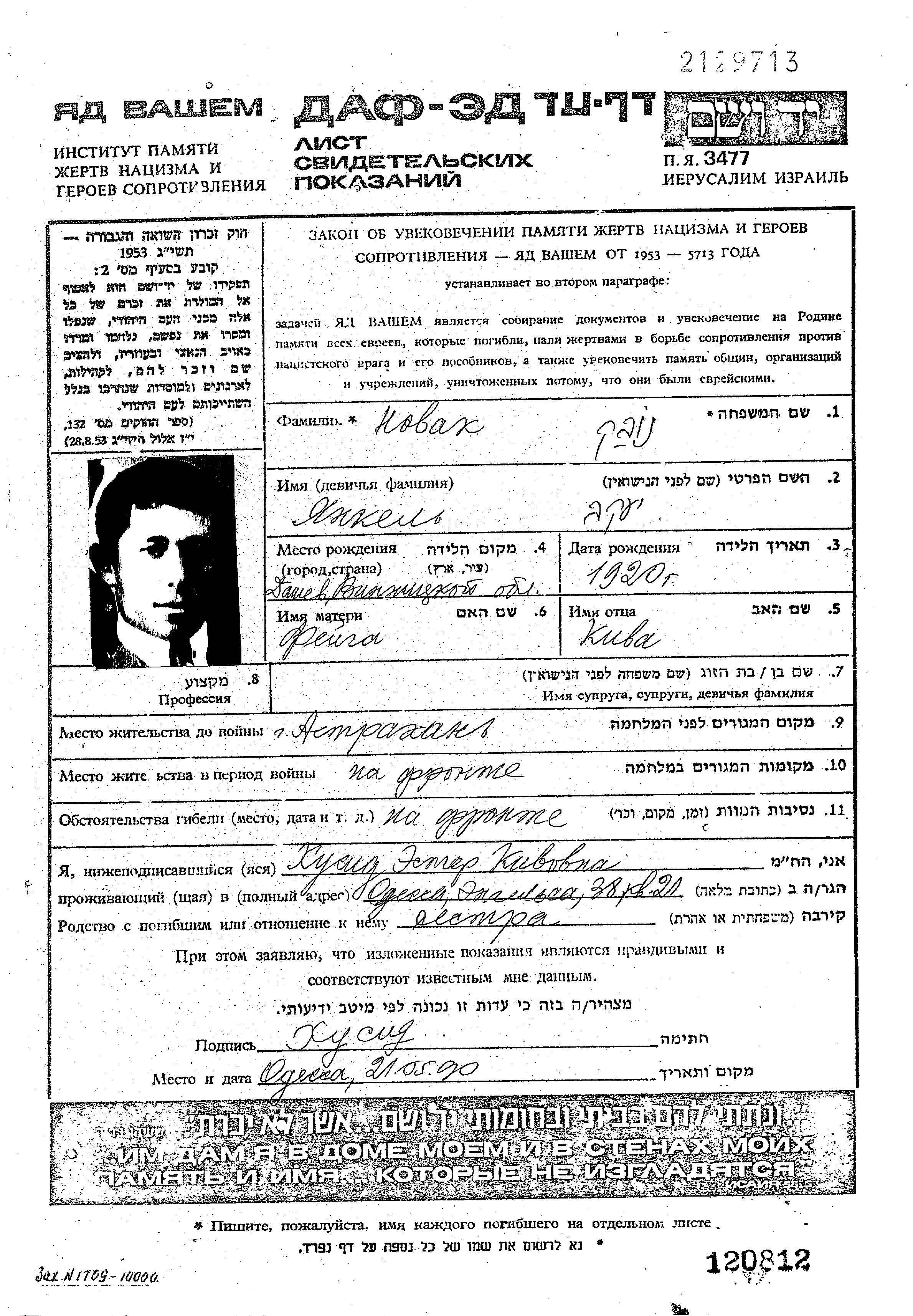 Novak Yankel 1920 Astrakhan, Russie (URSS) Feuille de témoignage