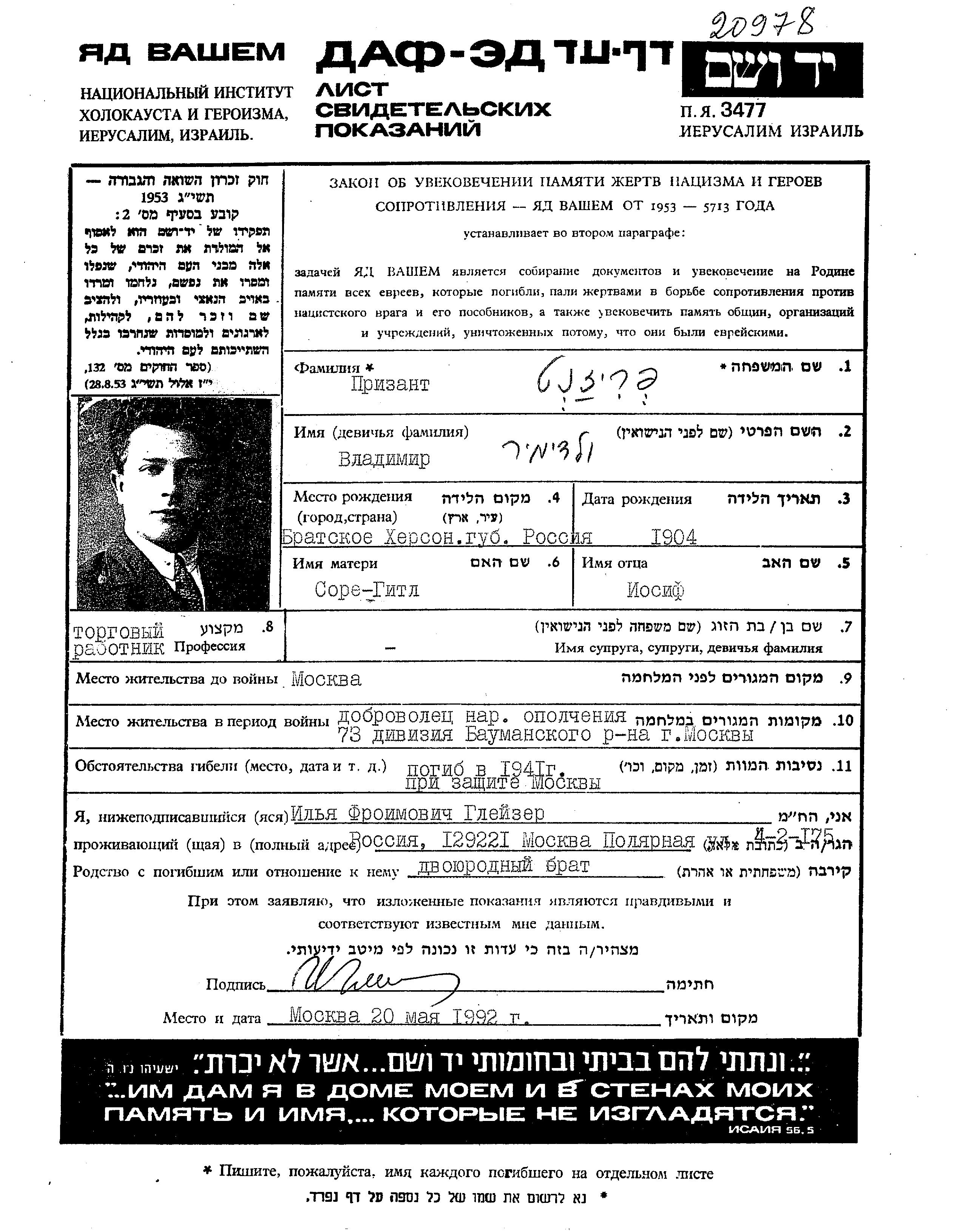 Prizant Vladimir 1904 Moskva, Russie (URSS) Feuille de témoignage