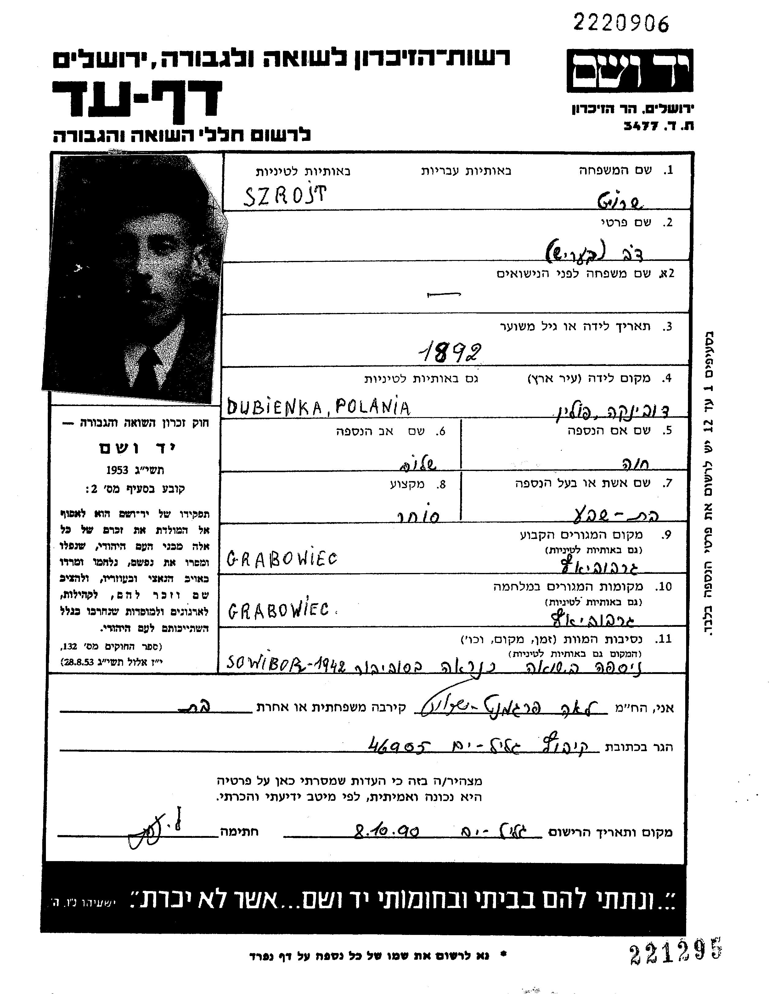Szrojt Dov Berish 1892 Grabowiec, Pologne Feuille de témoignage