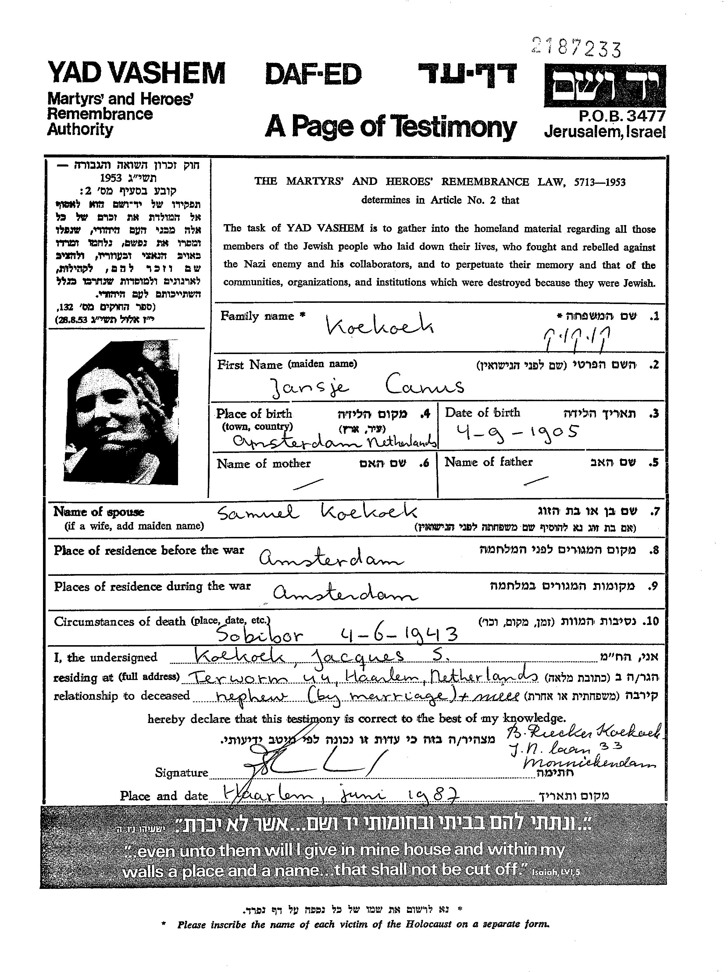 Koekoek Jansje 1905 Amsterdam, Pays-Bas Liste des Juifs des Pays-Bas assassinés