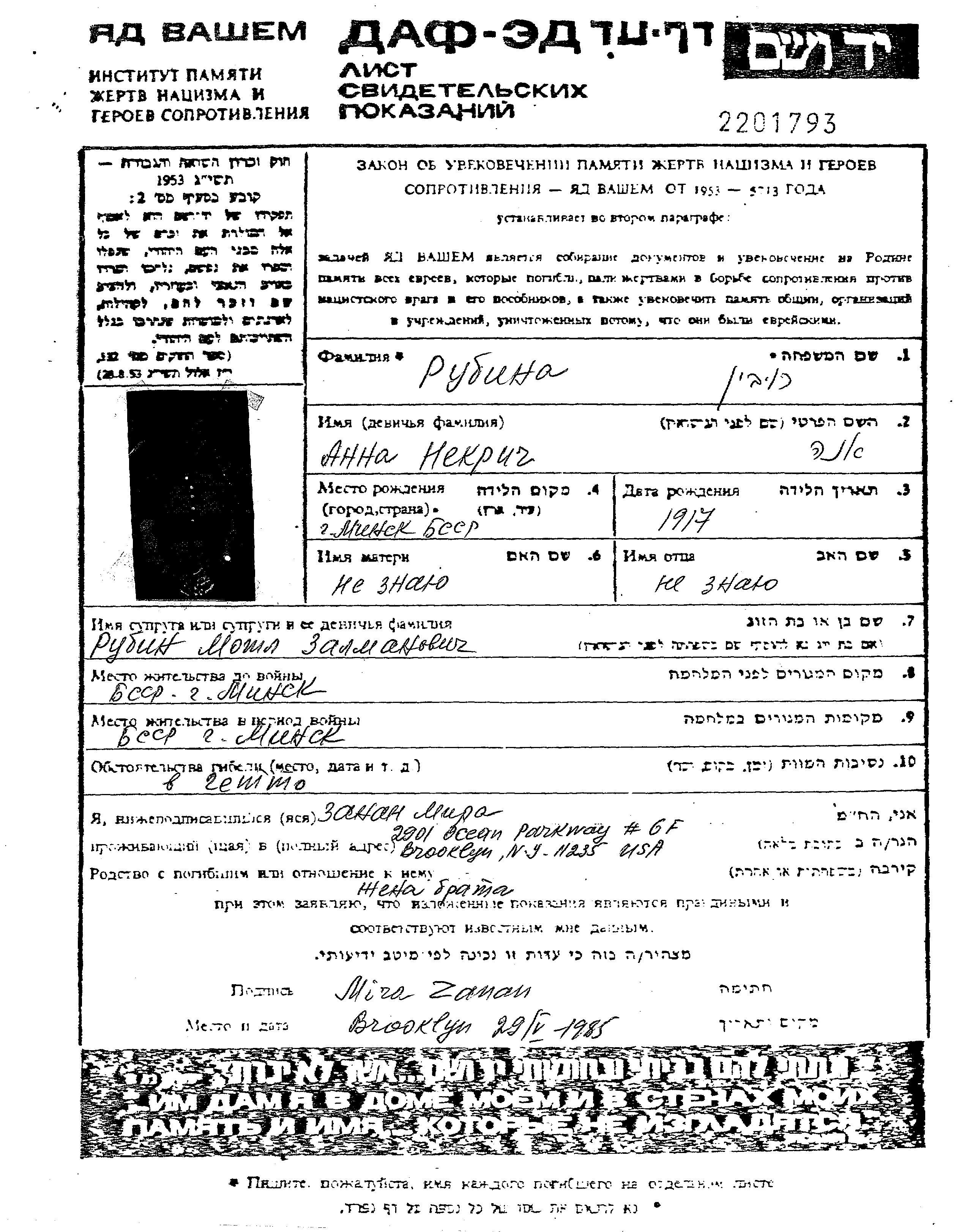 Rubin Anna 1917 Minsk, Bélorussie (URSS) Feuille de témoignage