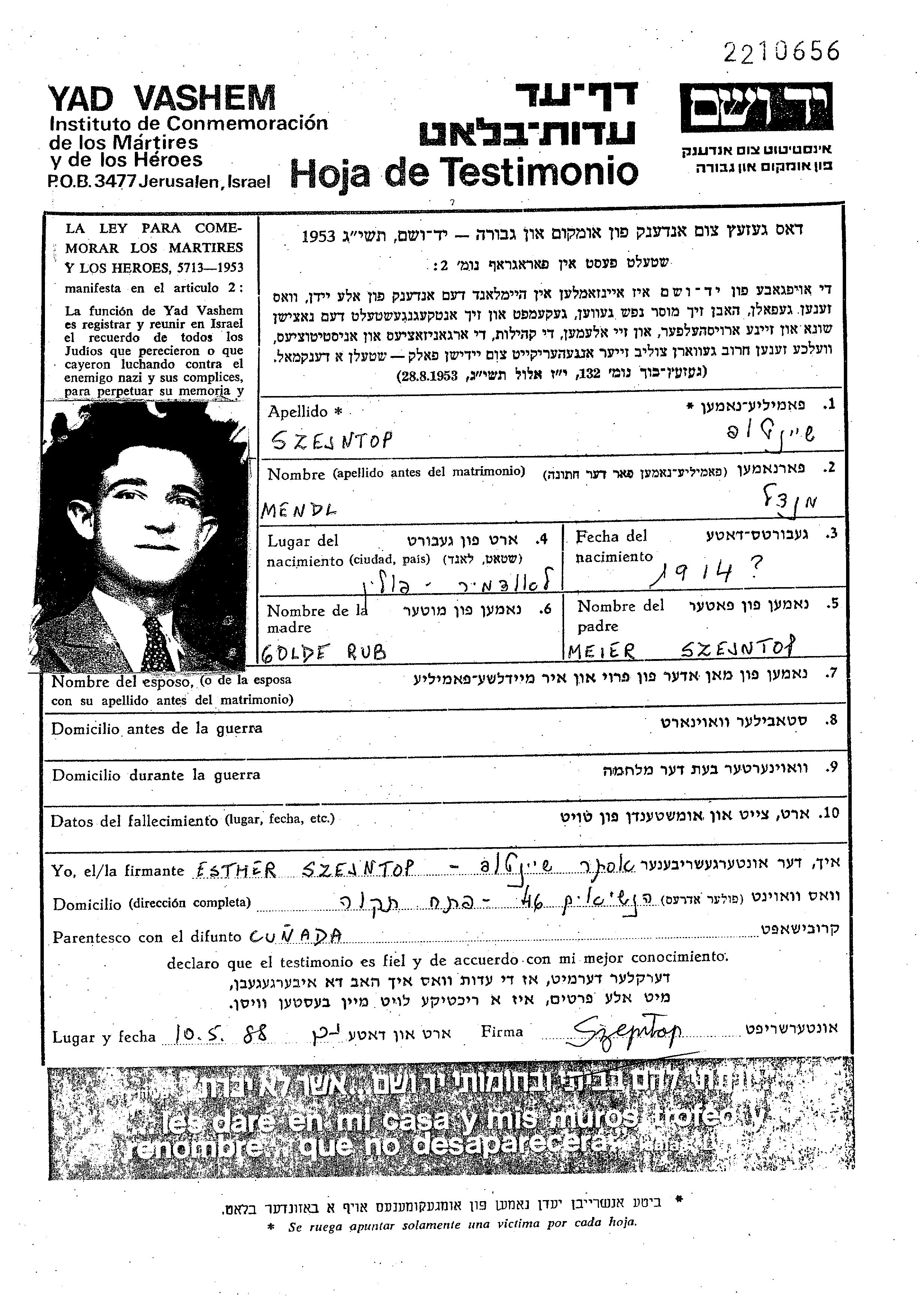 | Szejntop | Mendl | 1914 | endroit inconnu, | Feuille de témoignage |