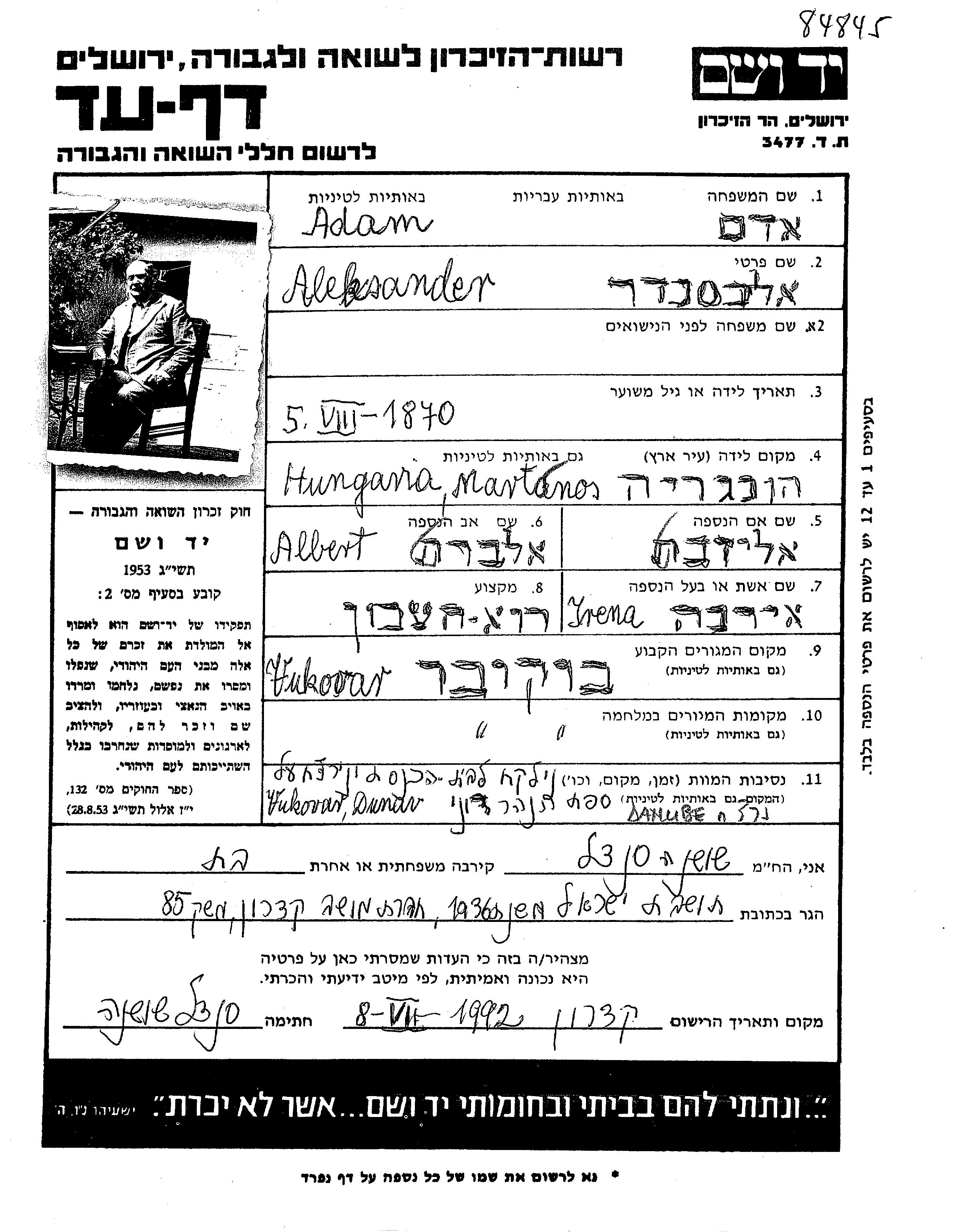 Aleksander Adam est né à Martonos, Yugoslavie en 1870. Il était Comptable. Avant la seconde guerre mondiale il vivait à Vukovar, Yugoslavie.