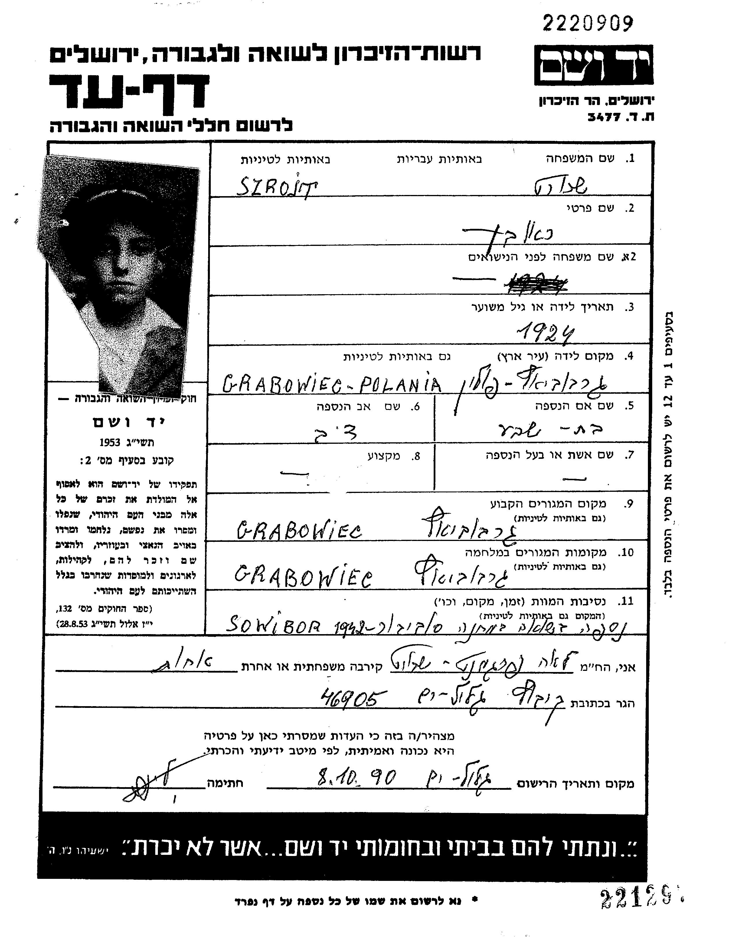 Szrojt Reuven 1924 Grabowiec, Pologne Feuille de témoignage