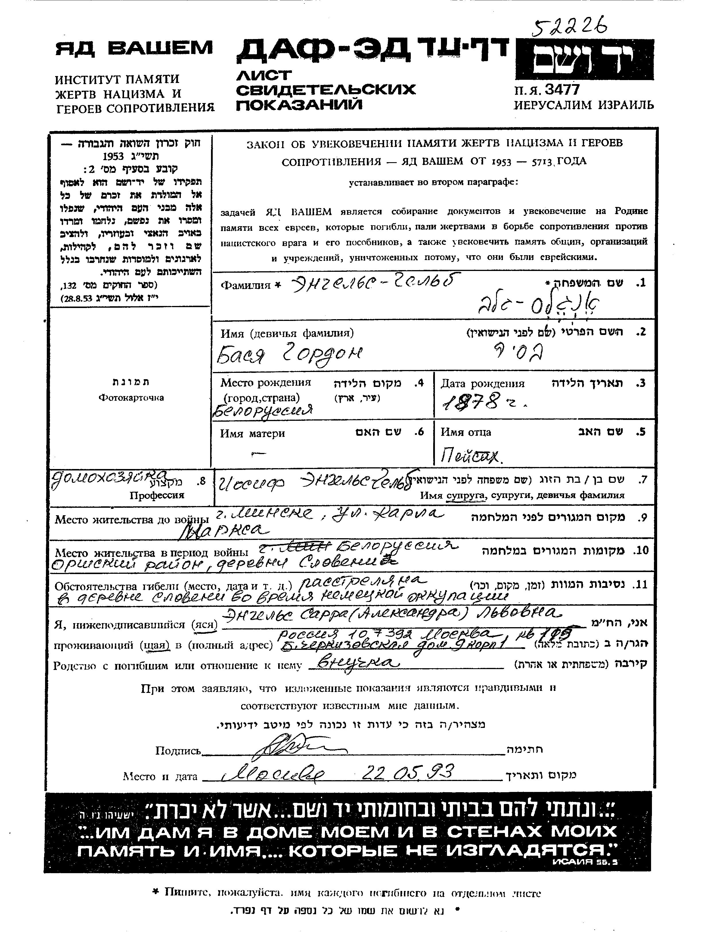 Engels Gelb Basia 1878 Minsk, Bélorussie (URSS) Feuille de témoignage