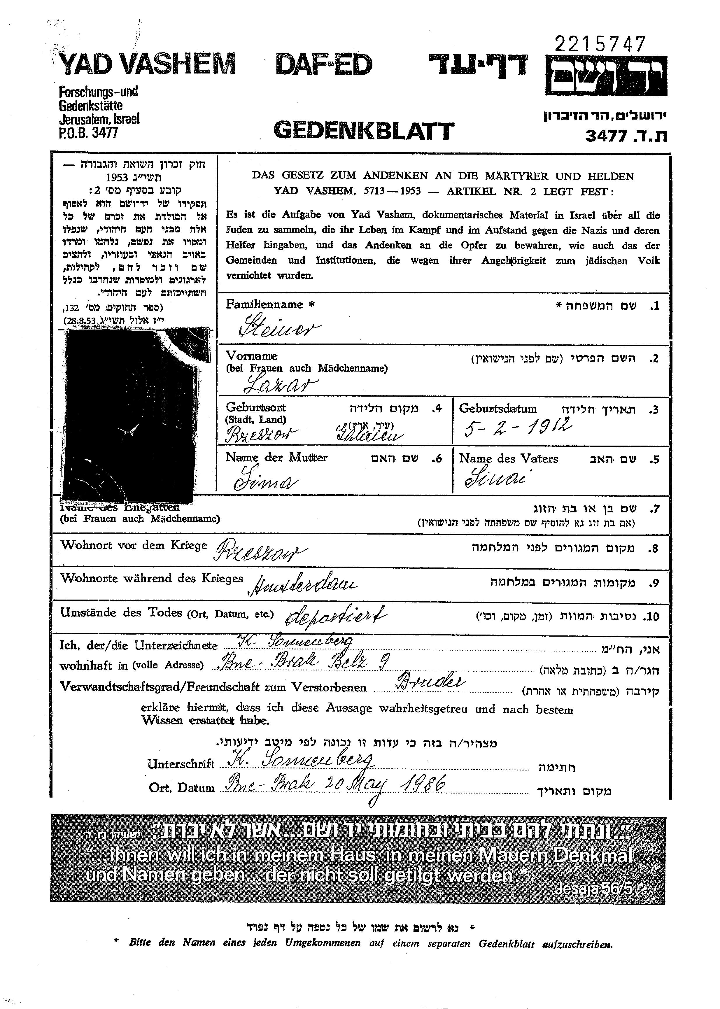 Steiner Lazar 1912 Rzeszow, Pologne Feuille de témoignage