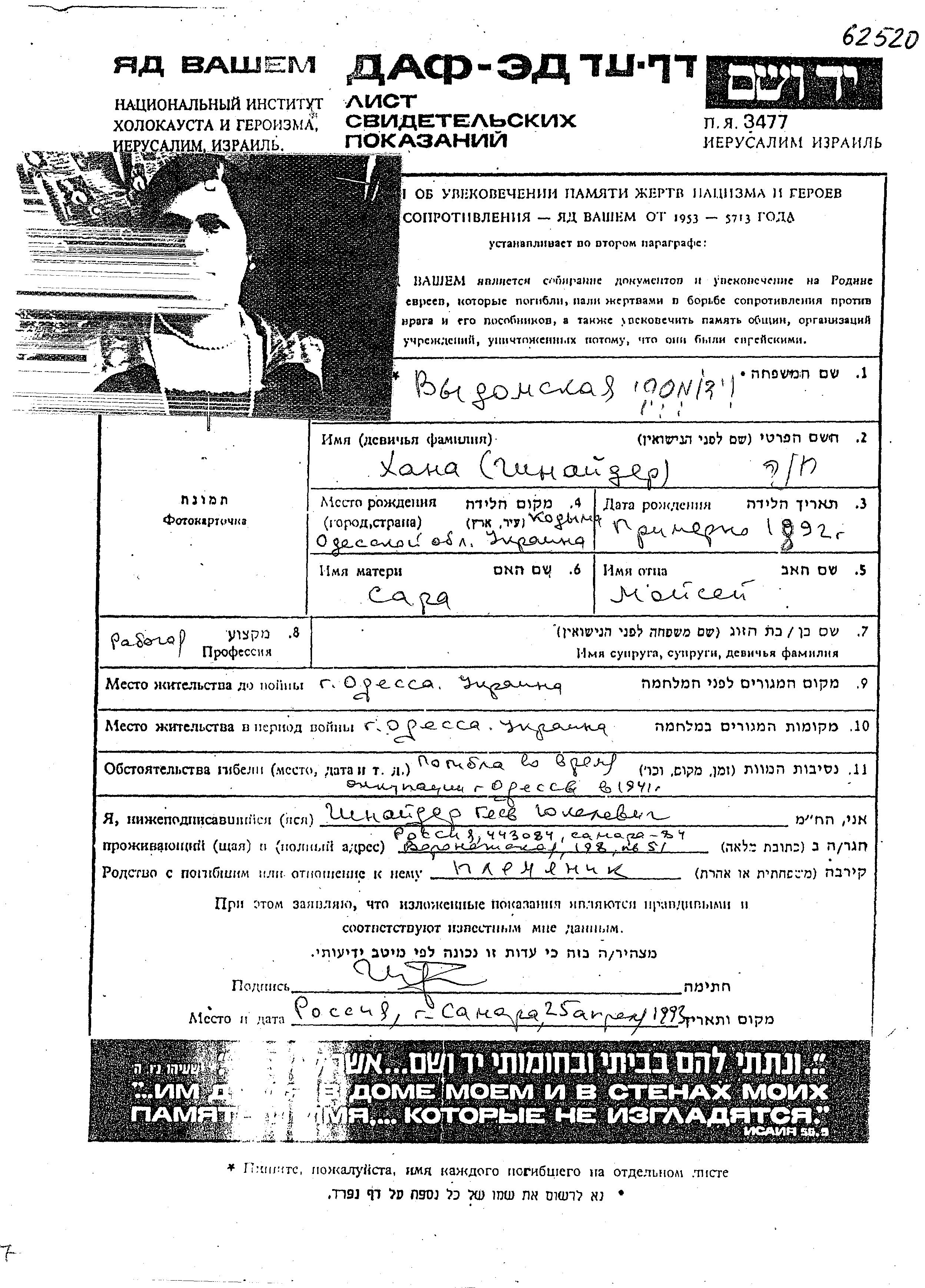 Vydomski Khana 1892 Odessa, Ukraine (URSS) Feuille de témoignage