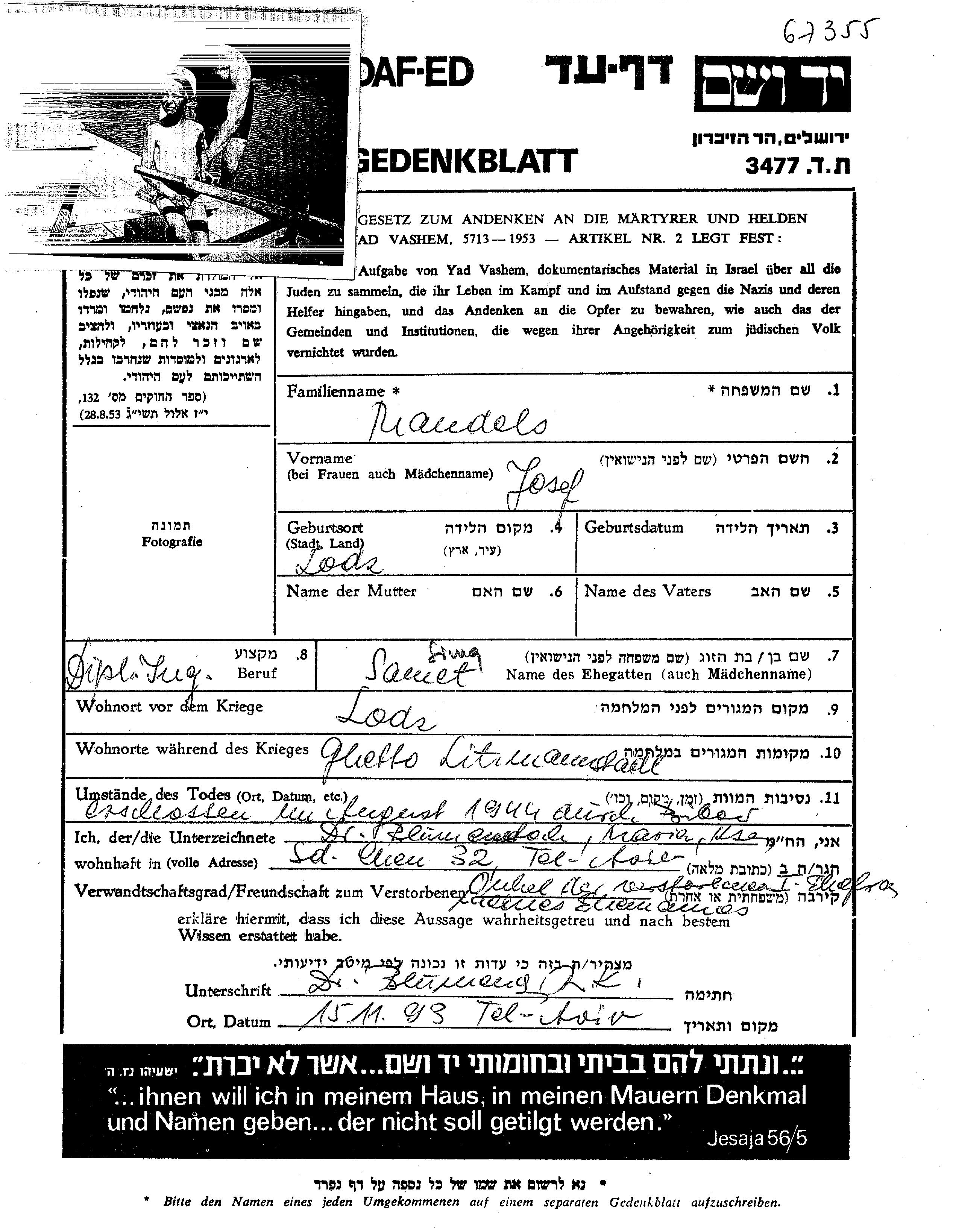 Josef Mandels est né à Łódź, Pologne. Il était Ingénieur. Avant la seconde guerre mondiale il vivait à Łódź, Pologne.