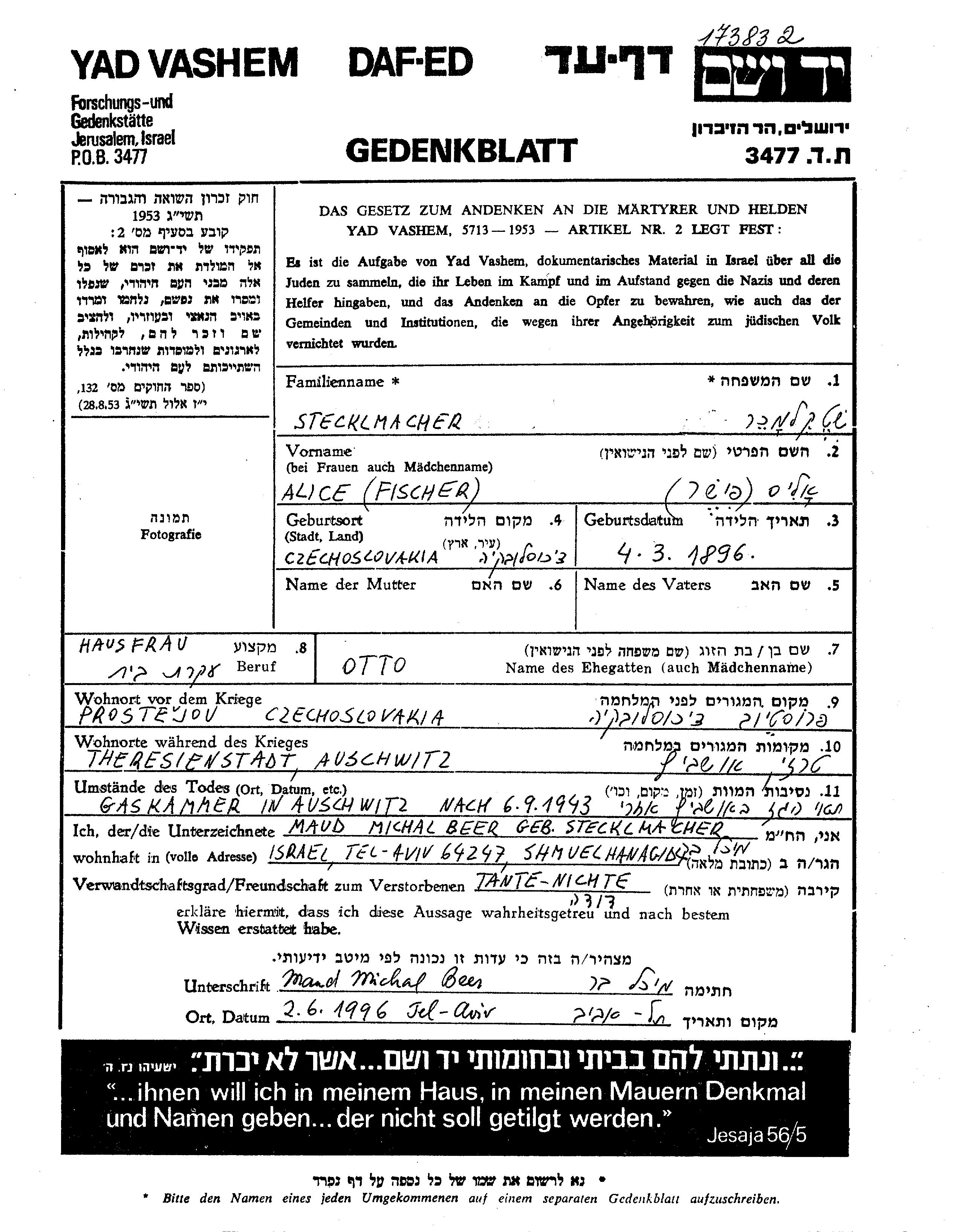 Stecklmacher Alice Ellis 1896 Prostejov, Tchécoslovaquie Feuille de témoignage