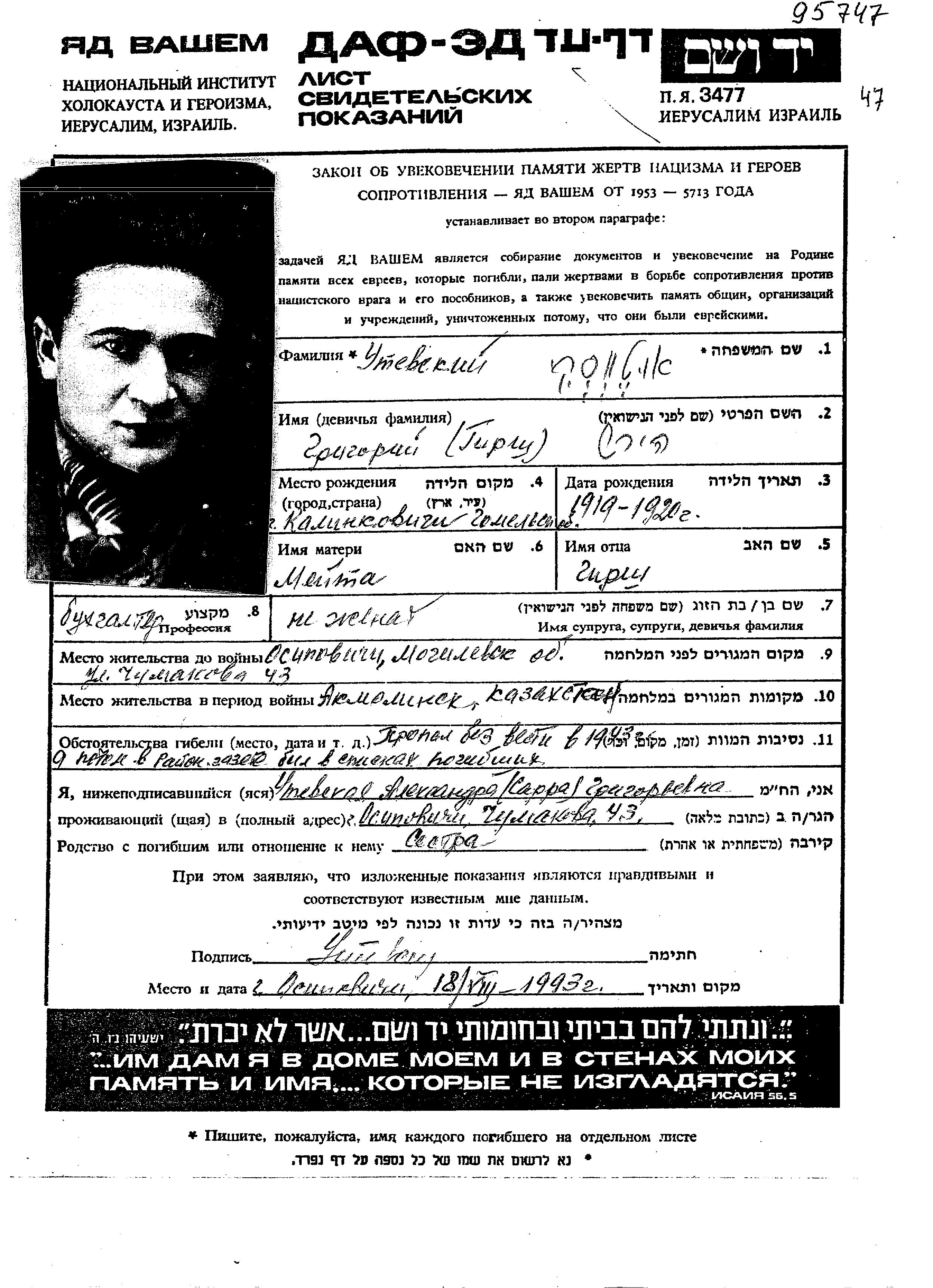 Utevski Grigori Hirsh 1919 Osipovichi, Bélorussie (URSS) Feuille de témoignage