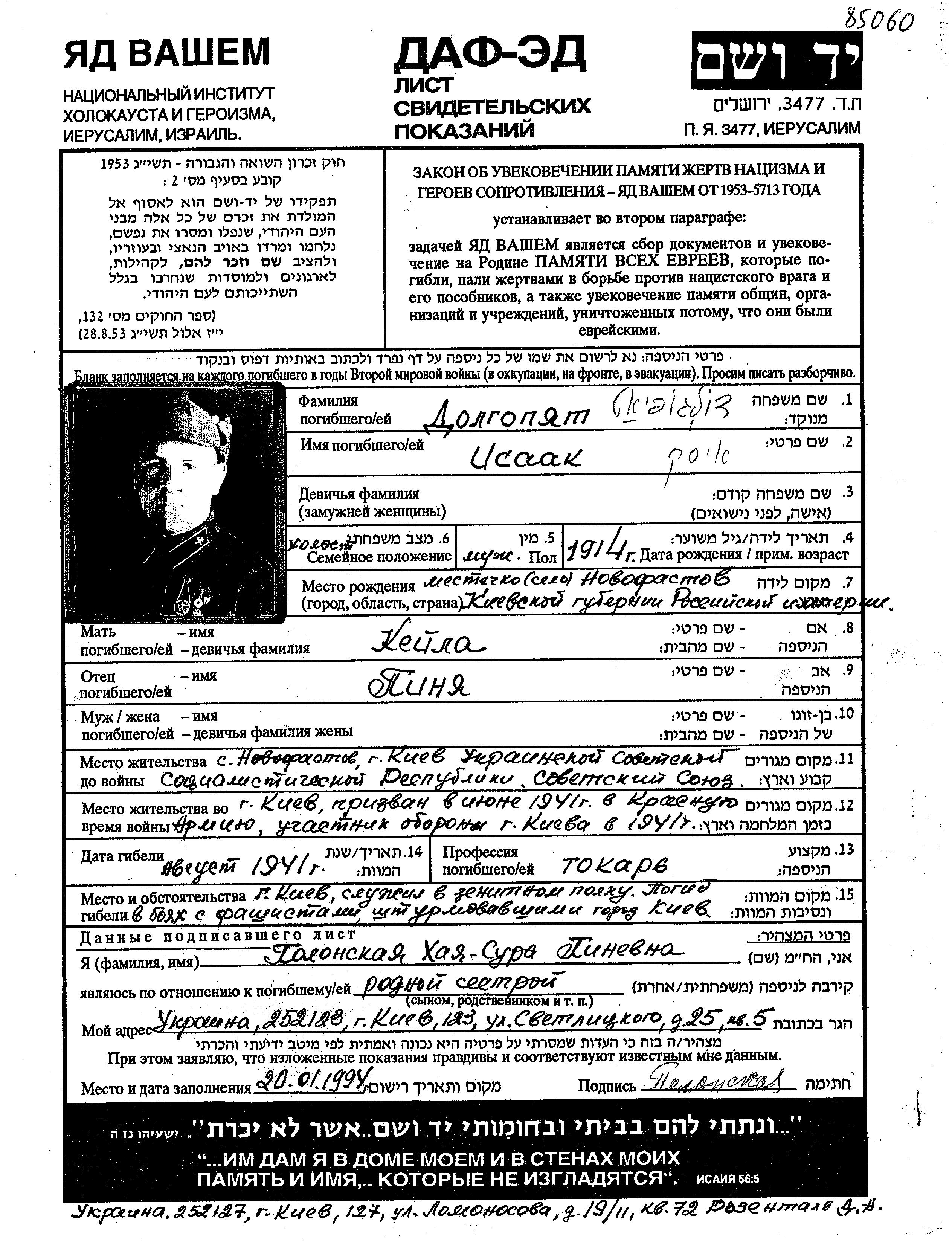 Dolgopyat Isaak 1914 Kiyev, Ukraine (URSS) Feuille de témoignage