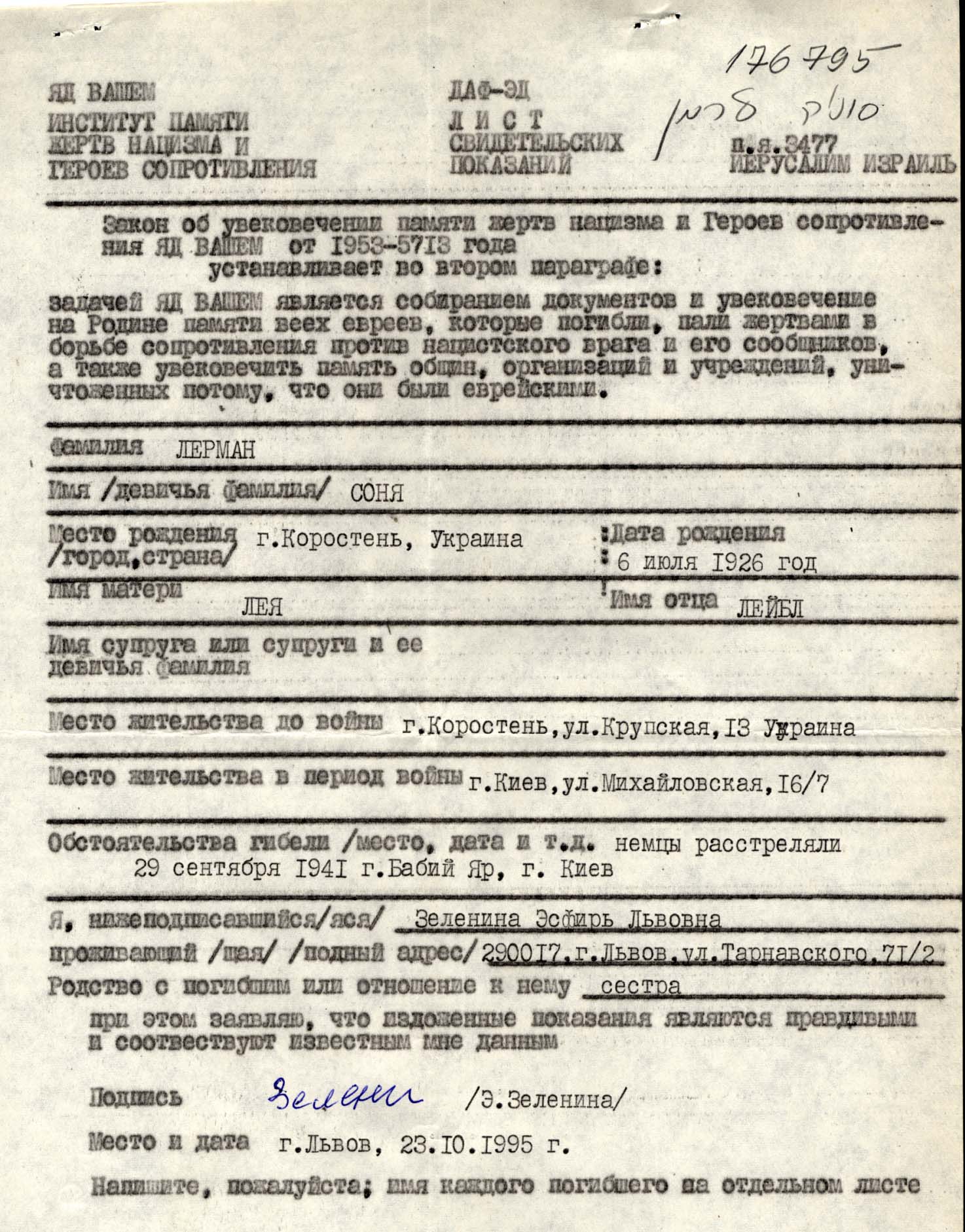 Lerman | Sonya | 1926 | Korosten, Ukraine (URSS) | Feuille de témoignage |