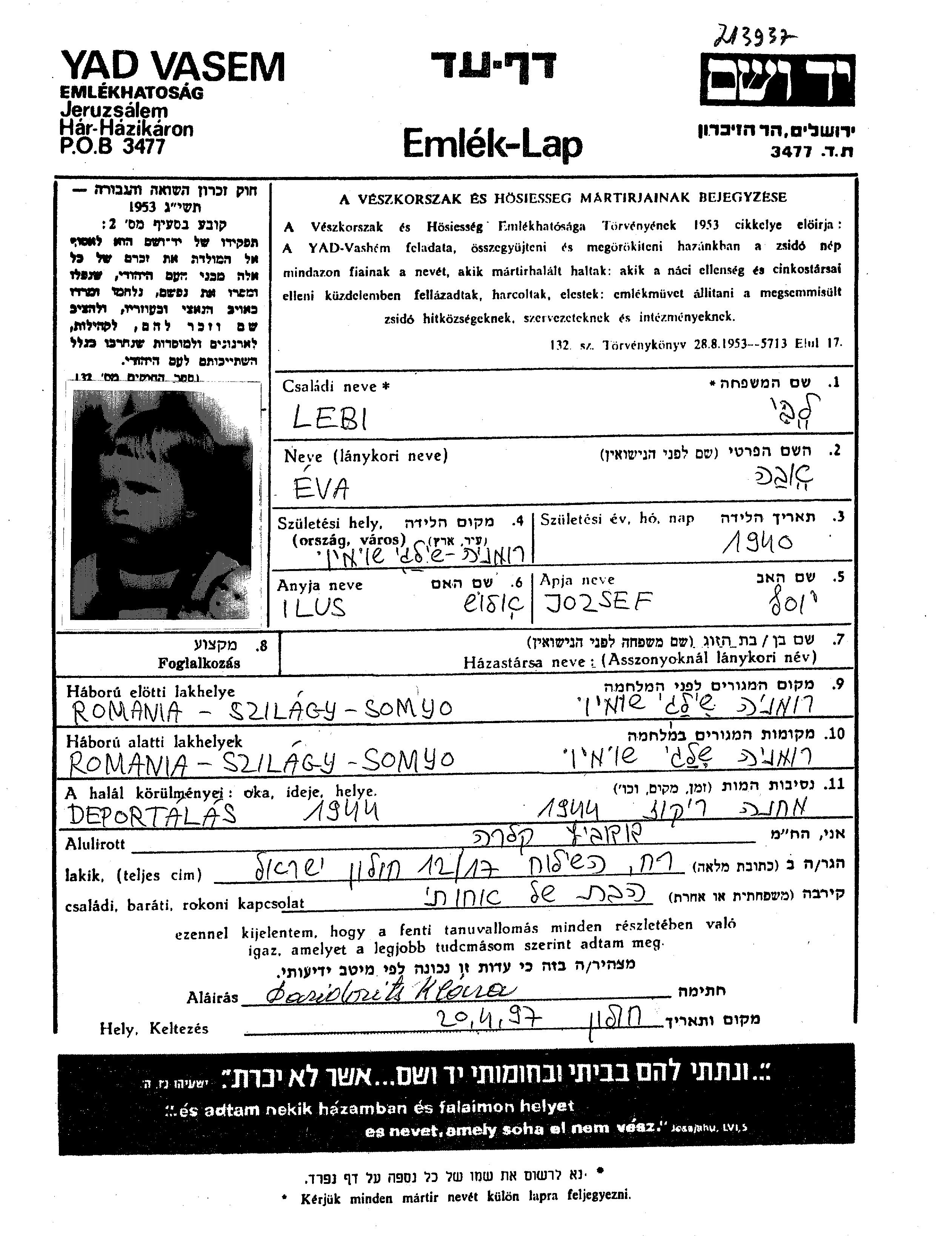 Labi Eva 1940 Szilagysomlyo, Roumanie Feuille de témoignage