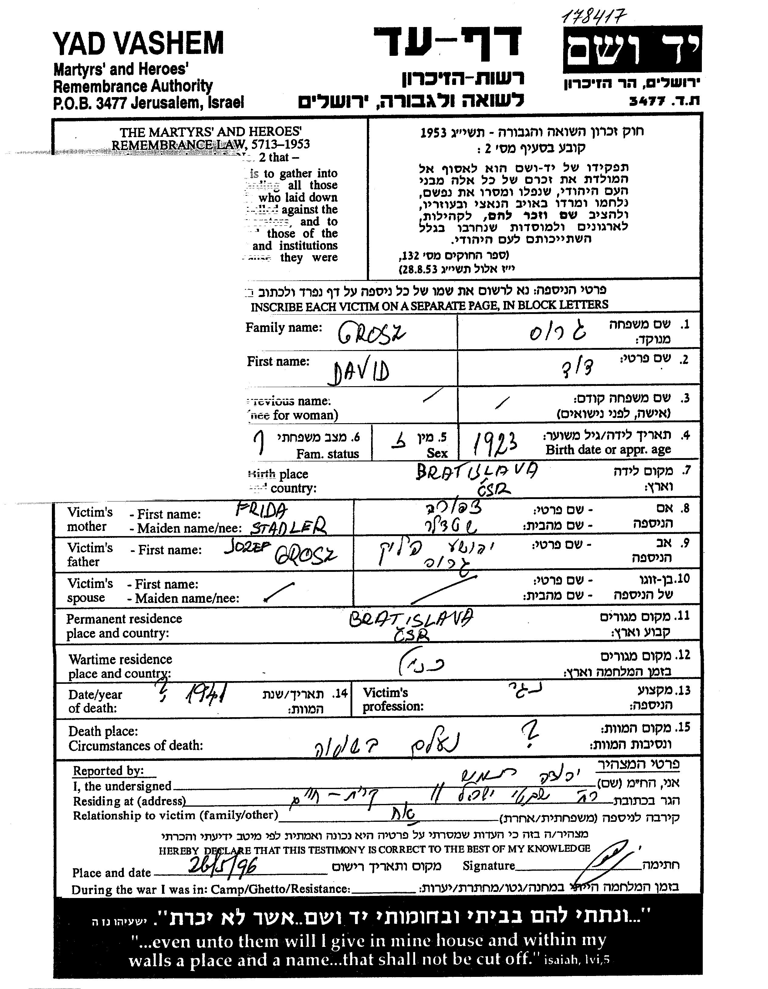 Grosz | David | 1923 | Bratislava, Tchécoslovaquie | Feuille de témoignage |