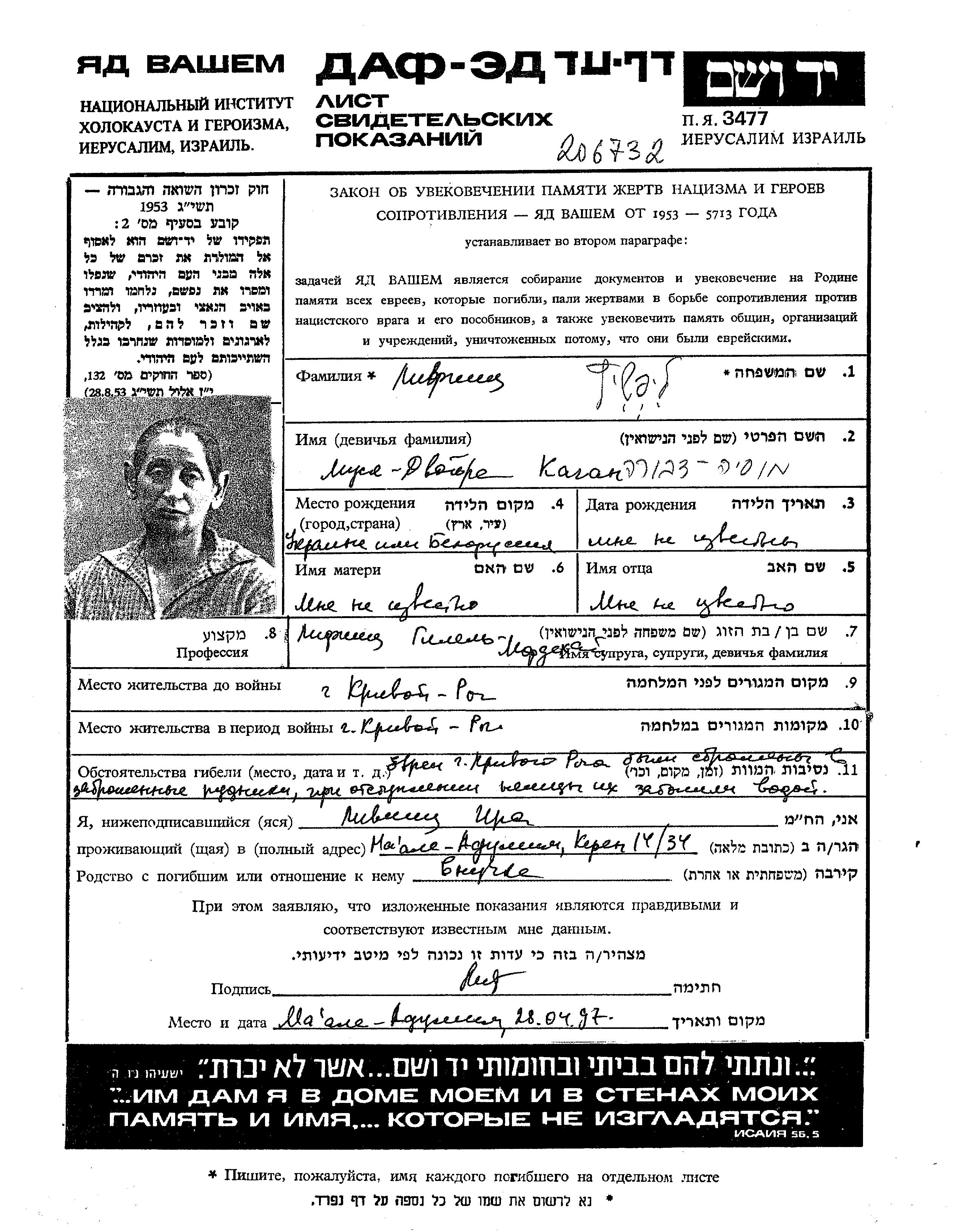Lifshitz | Musya Dvoira | Krivoy Rog, Ukraine (URSS) | Feuille de témoignage | |