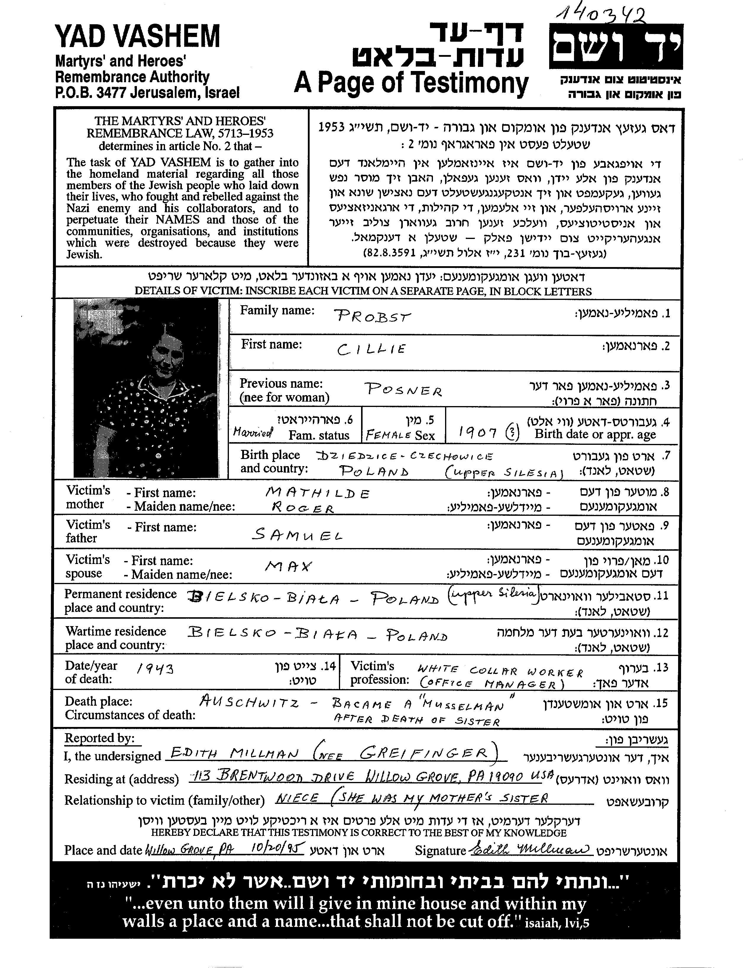 Cillie Probst née Posner est née à Dziedzice, Pologne en 1907. Elle était Employé/e de bureau. Avant la seconde guerre mondiale elle vivait à Bielsko, Pologne.