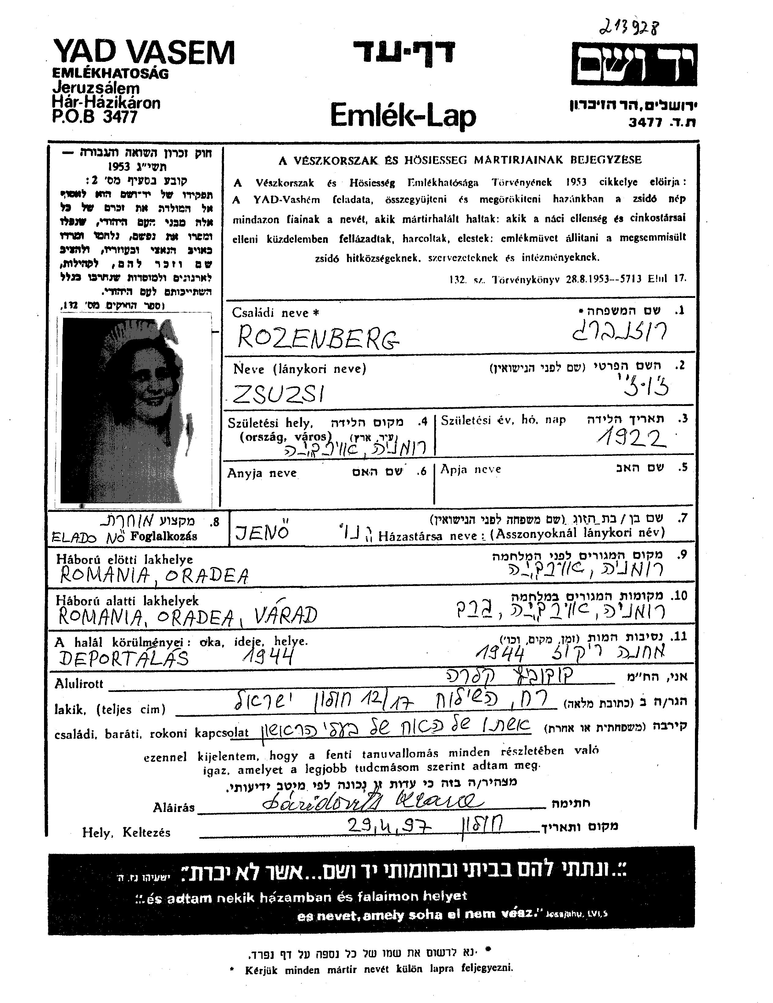 Rozenberg Zsuzsi 1922 Oradea, Roumanie Feuille de témoignage
