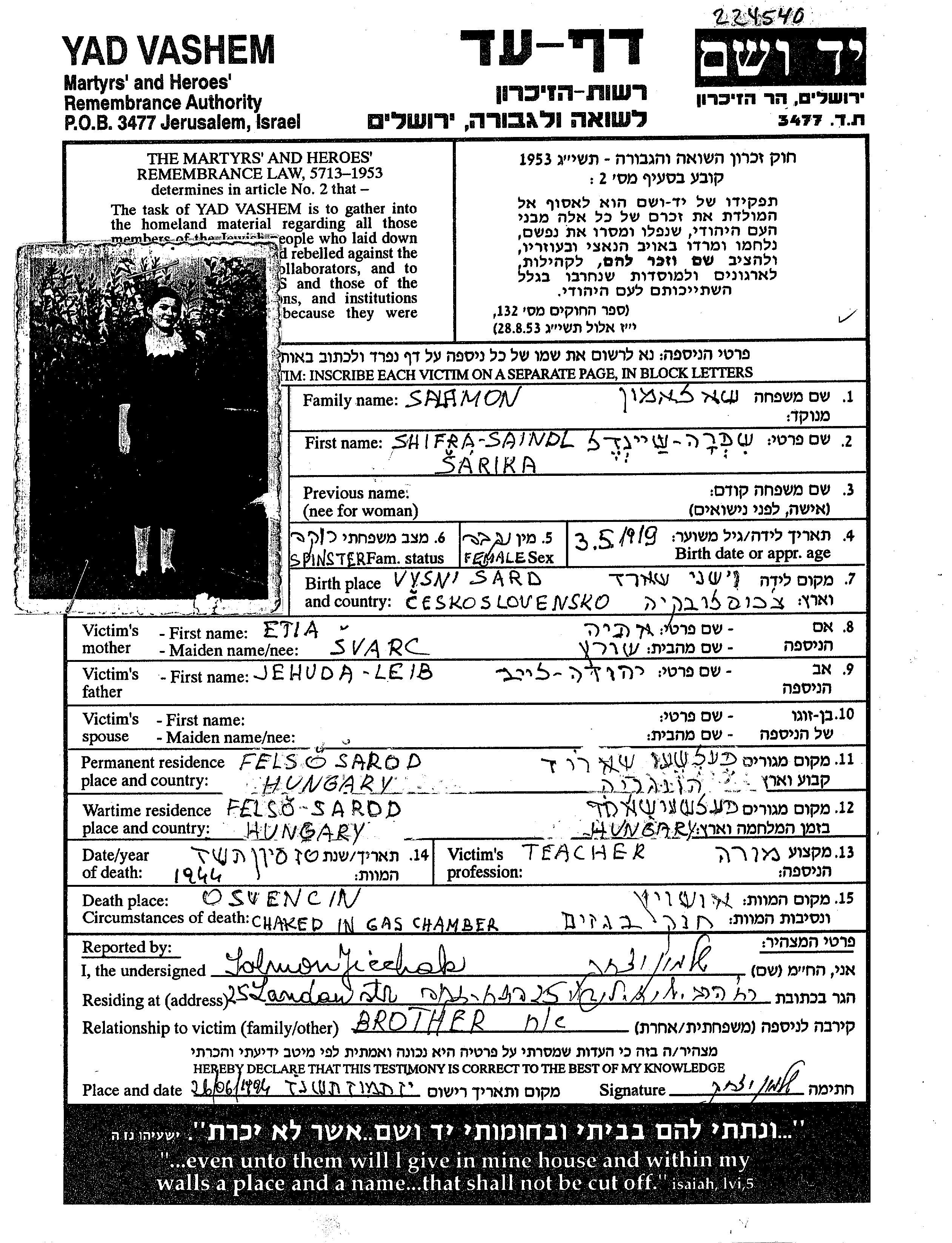 Salamon Shalamon Saindl Sarika Shifra 1919 Felsosarad, Tchécoslovaquie Feuille de témoignage