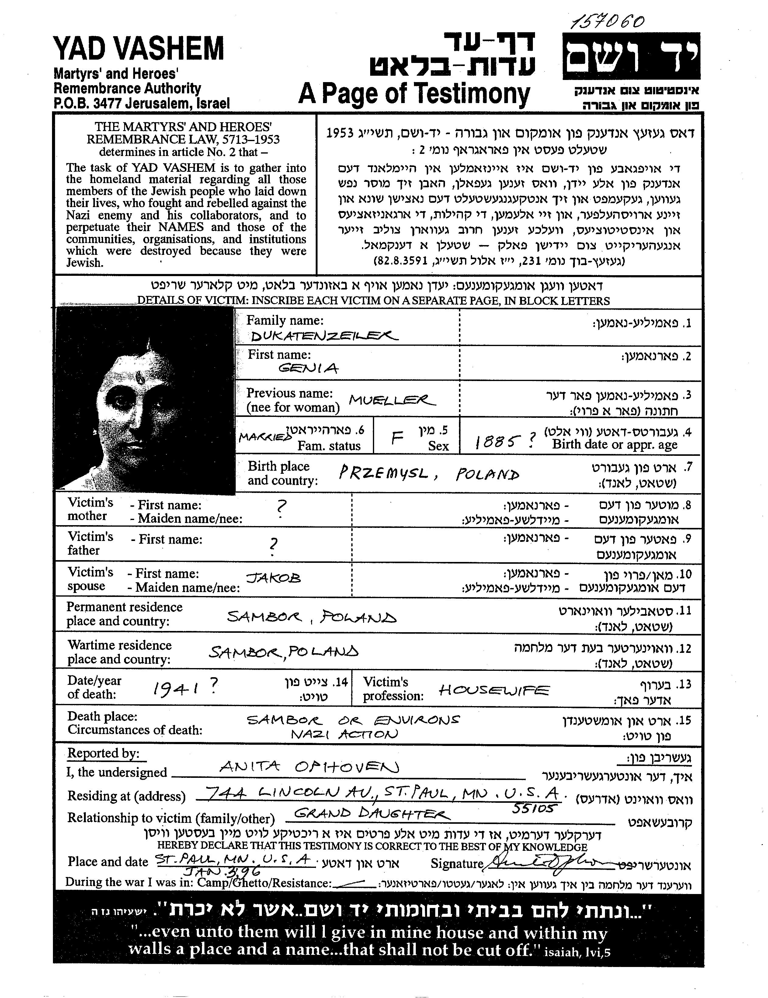 Dukatenzeiler | Genia | 1885 | Sambor, Pologne | Feuille de témoignage |