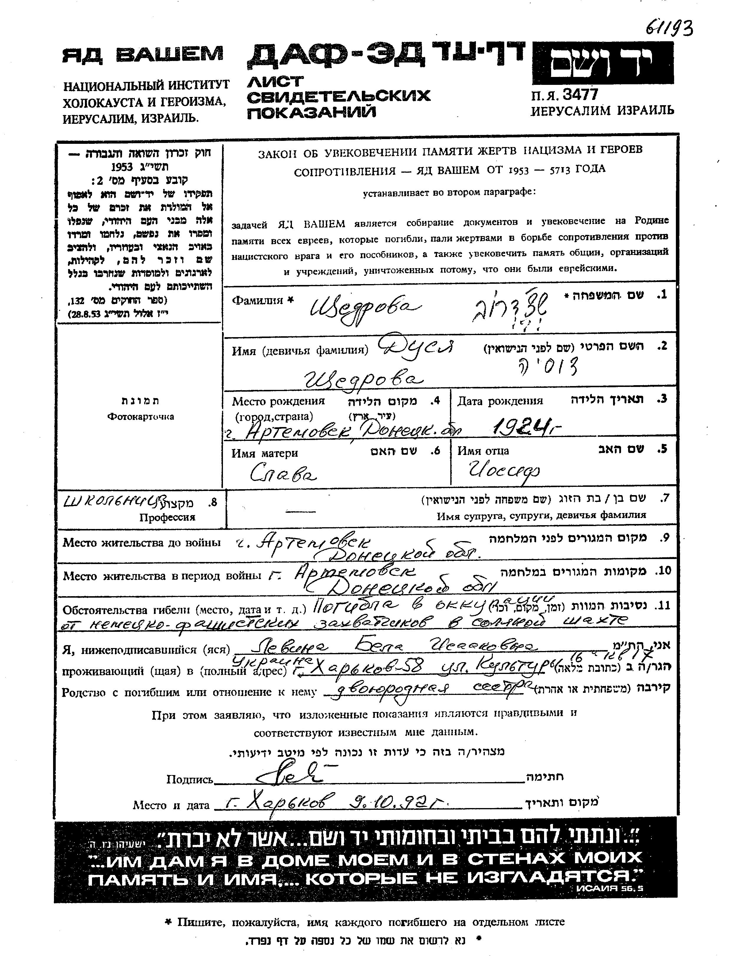 Shchedrov Dusia 1924 Artemovsk, Ukraine (URSS) Feuille de témoignage