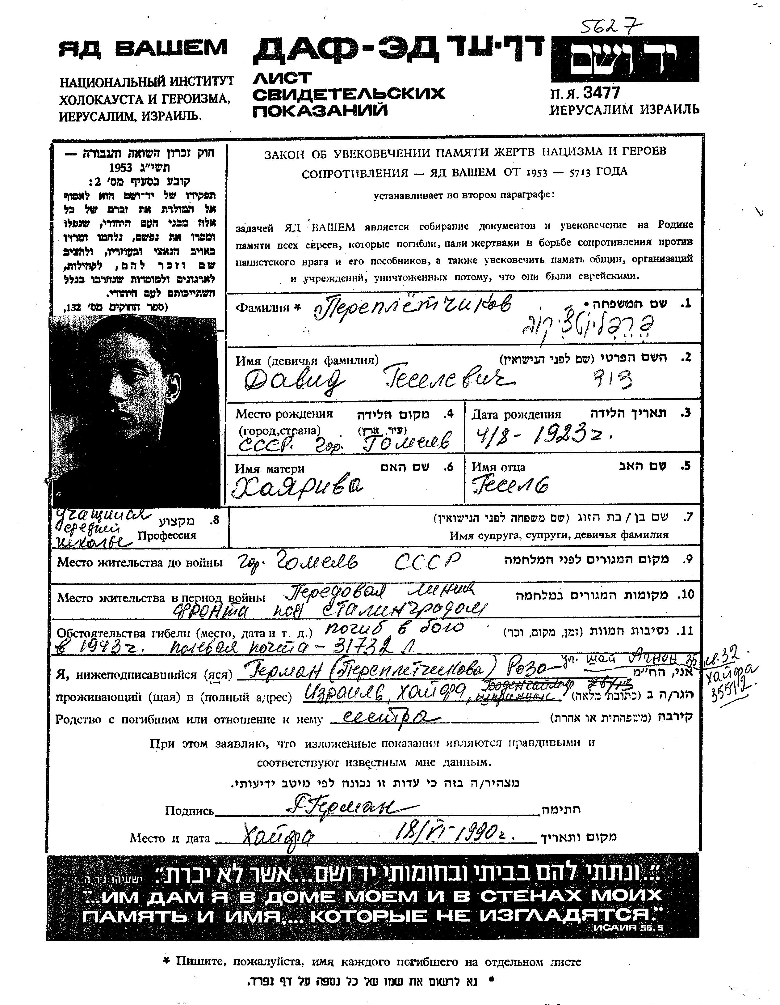 Pereplyotchikov David 1923 Gomel, Bélorussie (URSS) Feuille de témoignage