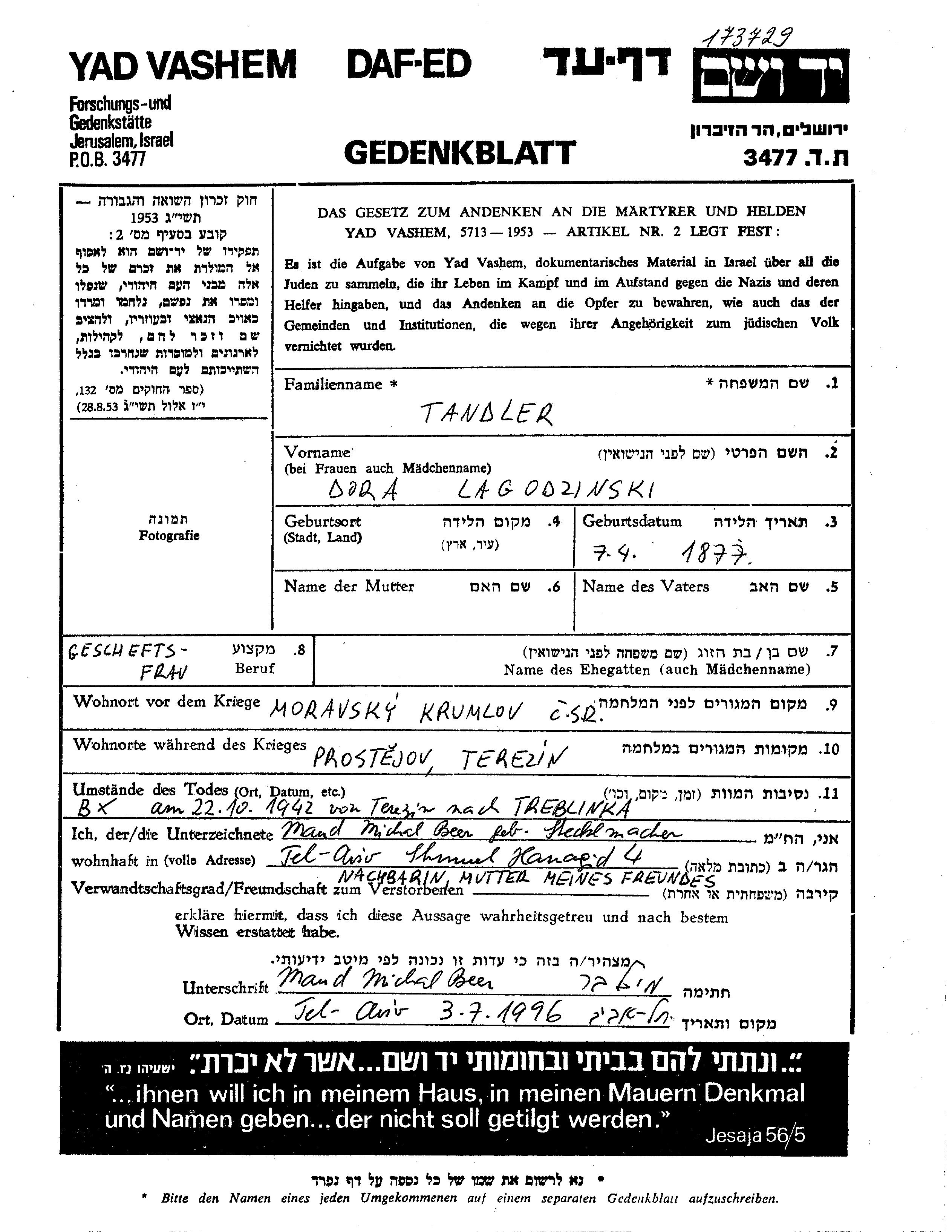 Tandler | Dora | 1877 | Moravsky Krumlov, Tchécoslovaquie | Feuille de témoignage |