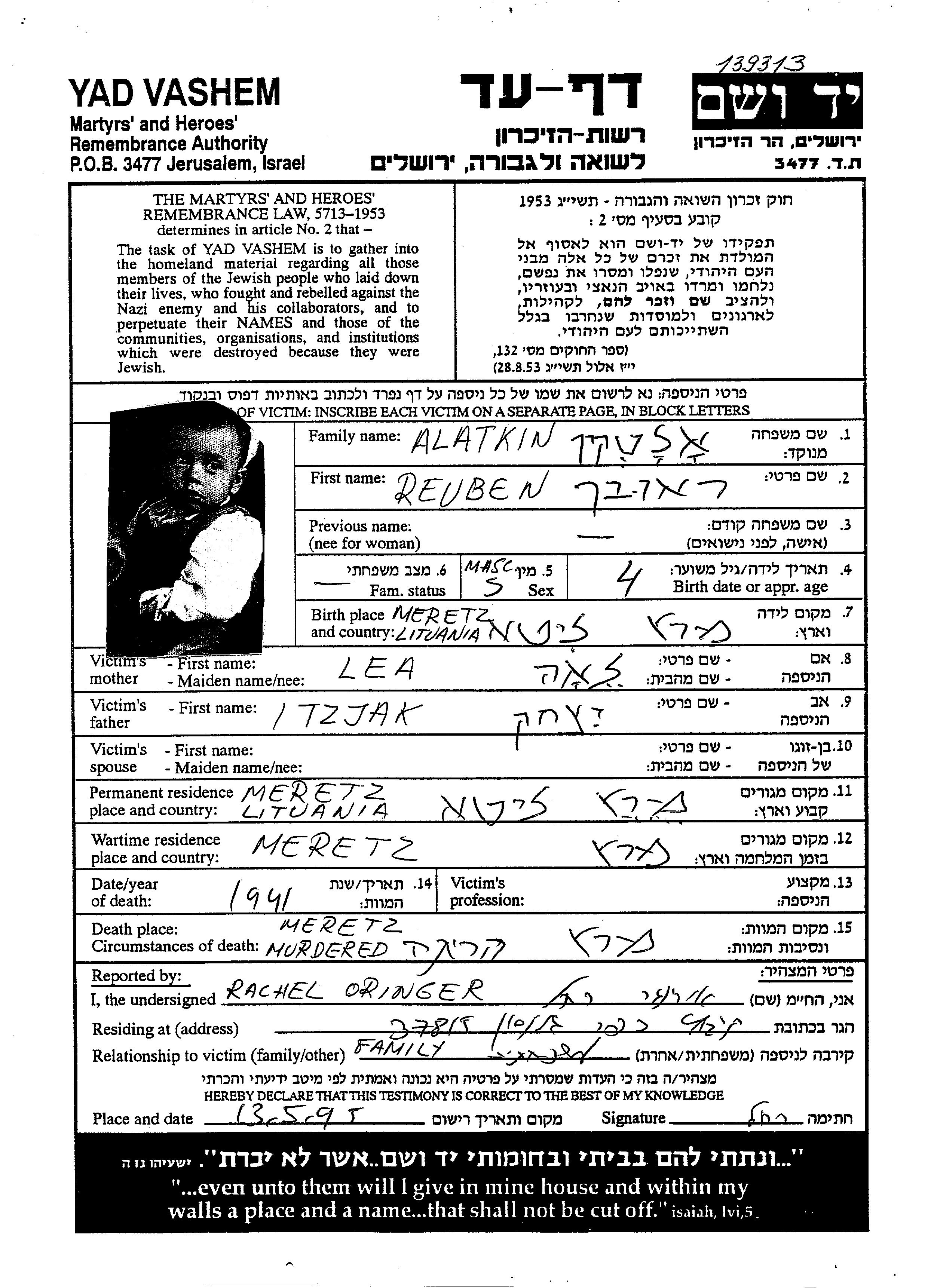 Alatkin Reuben 1937 Merch, Lituanie Feuille de témoignage