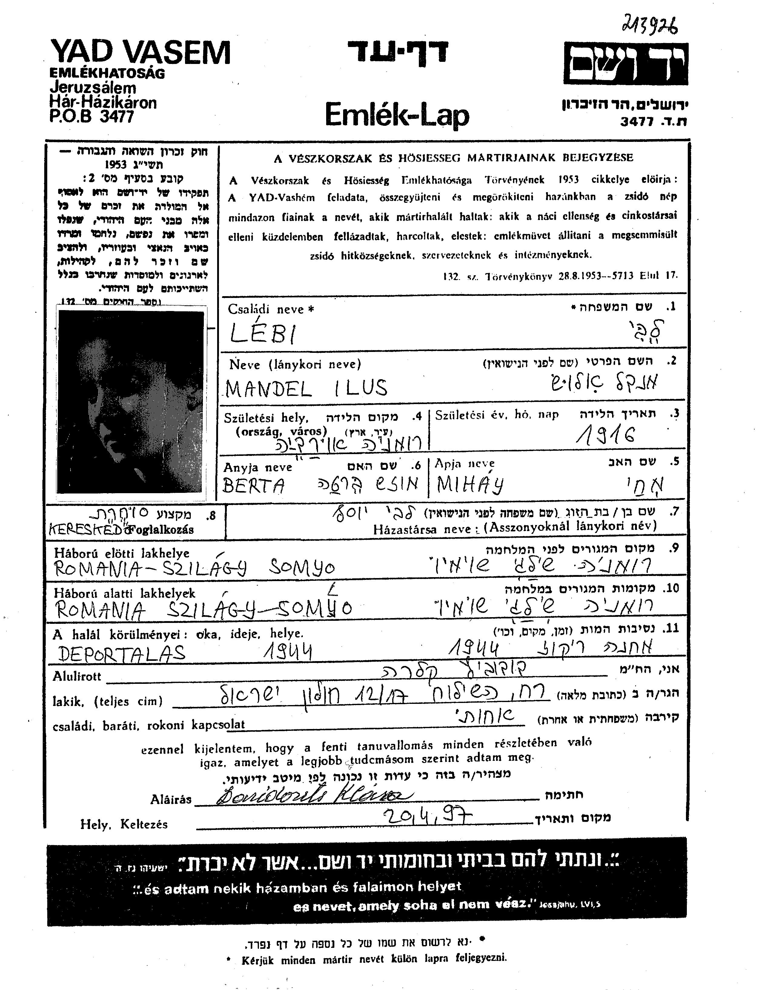 Lebi Labi Ilus 1916 Szilagysomlyo, Roumanie Feuille de témoignage