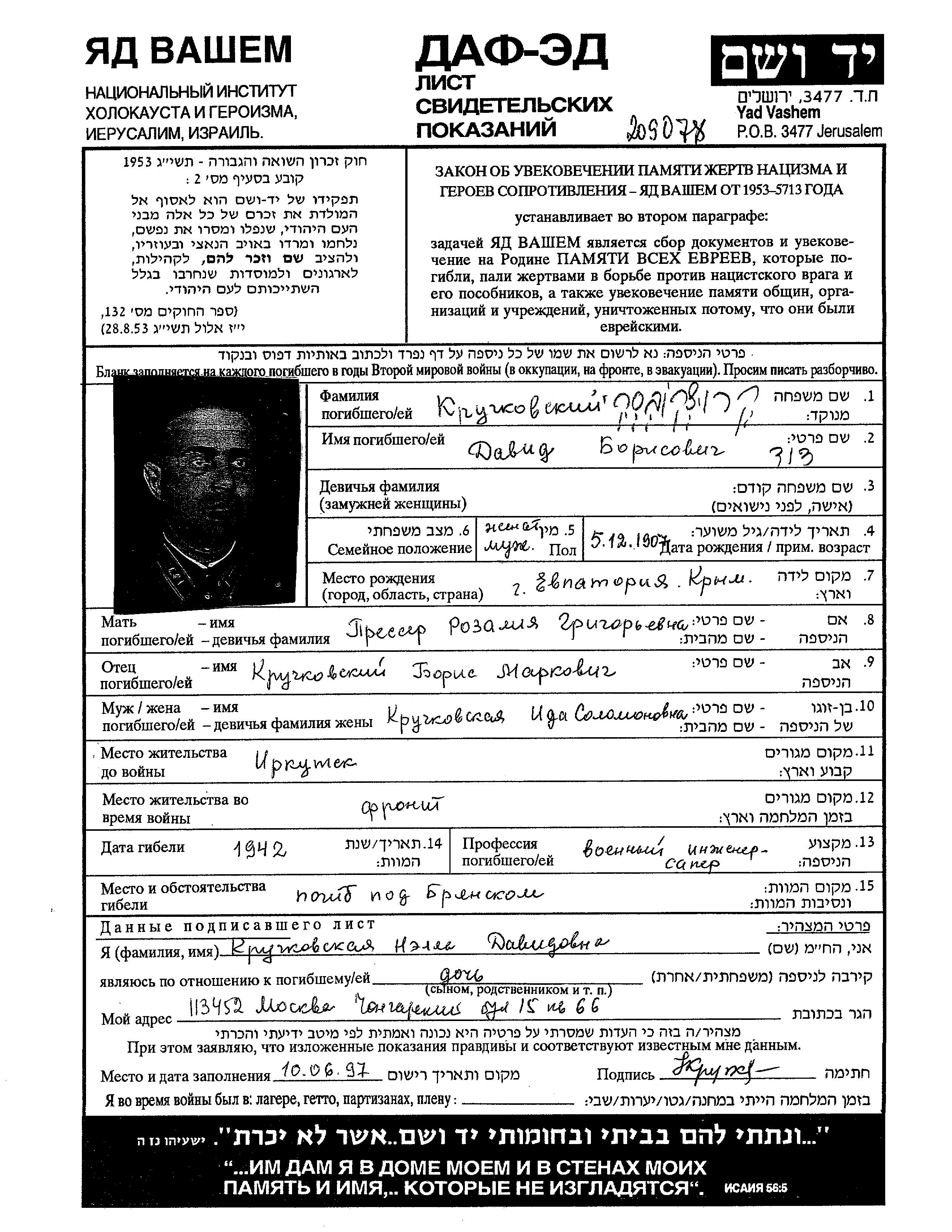 Kruchkovski David 1907 Irkutsk, Russie (URSS) Feuille de témoignage
