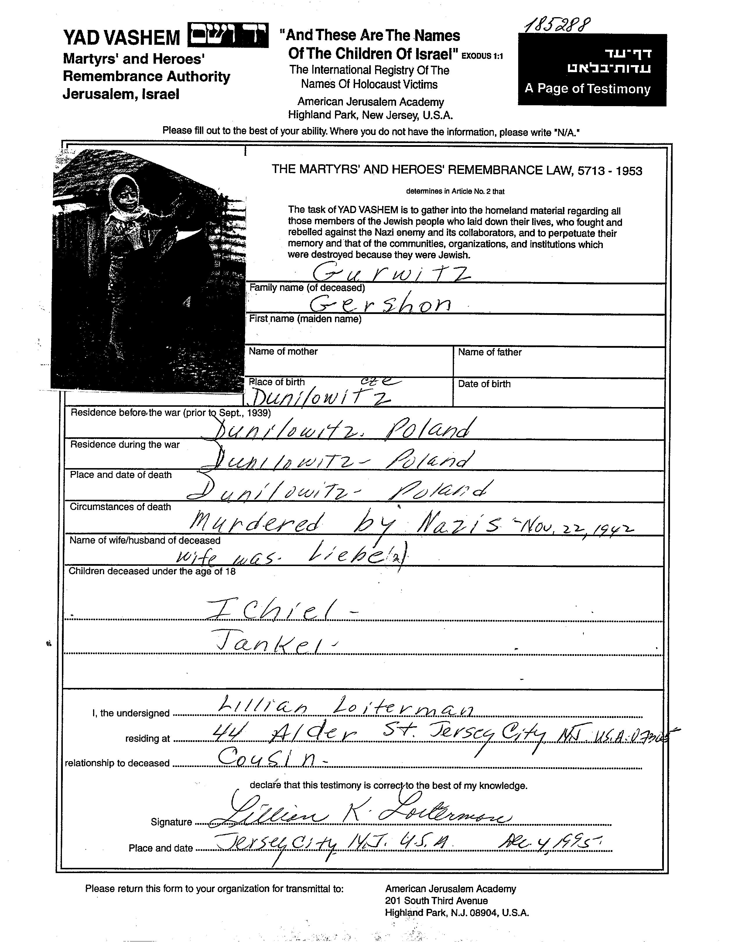 Gurwitz Gershon Dunilowicze, Pologne Feuille de témoignage